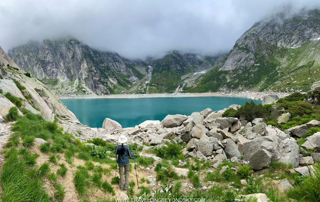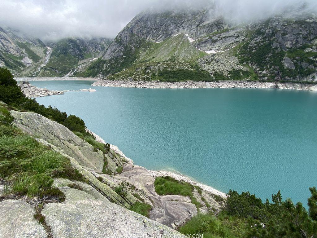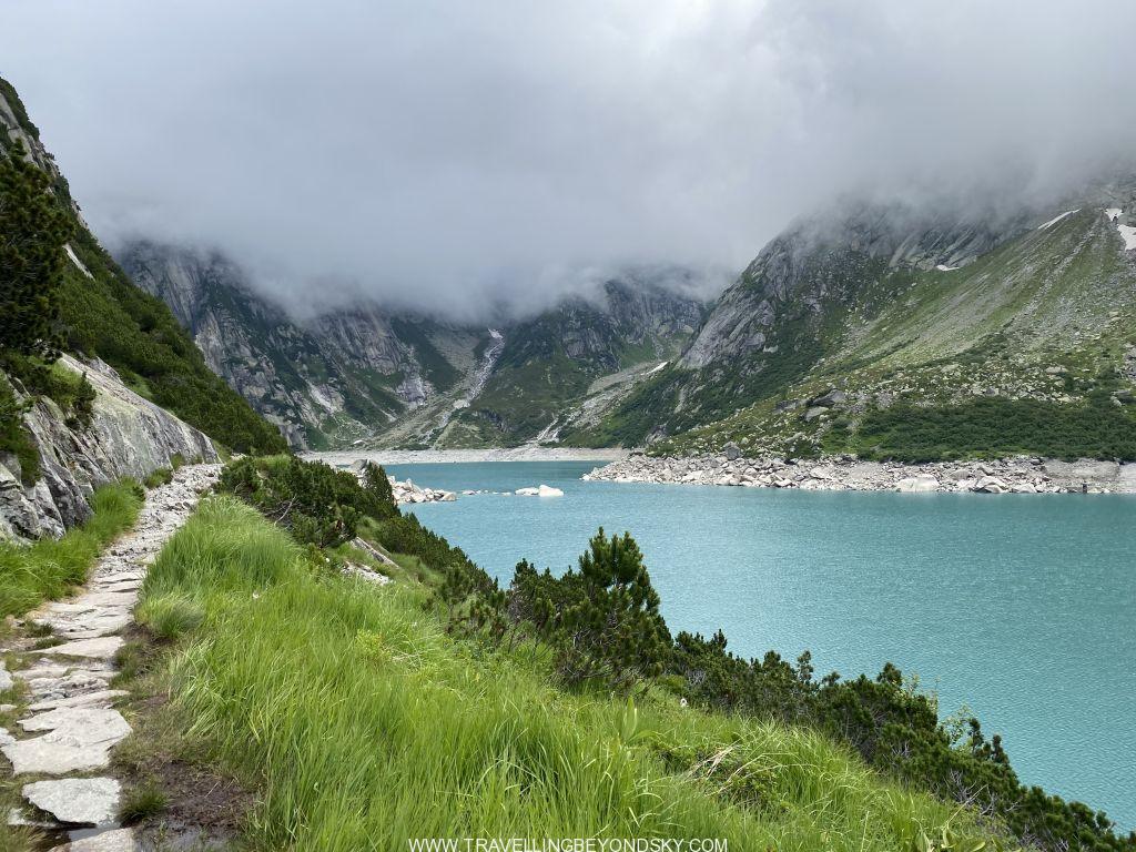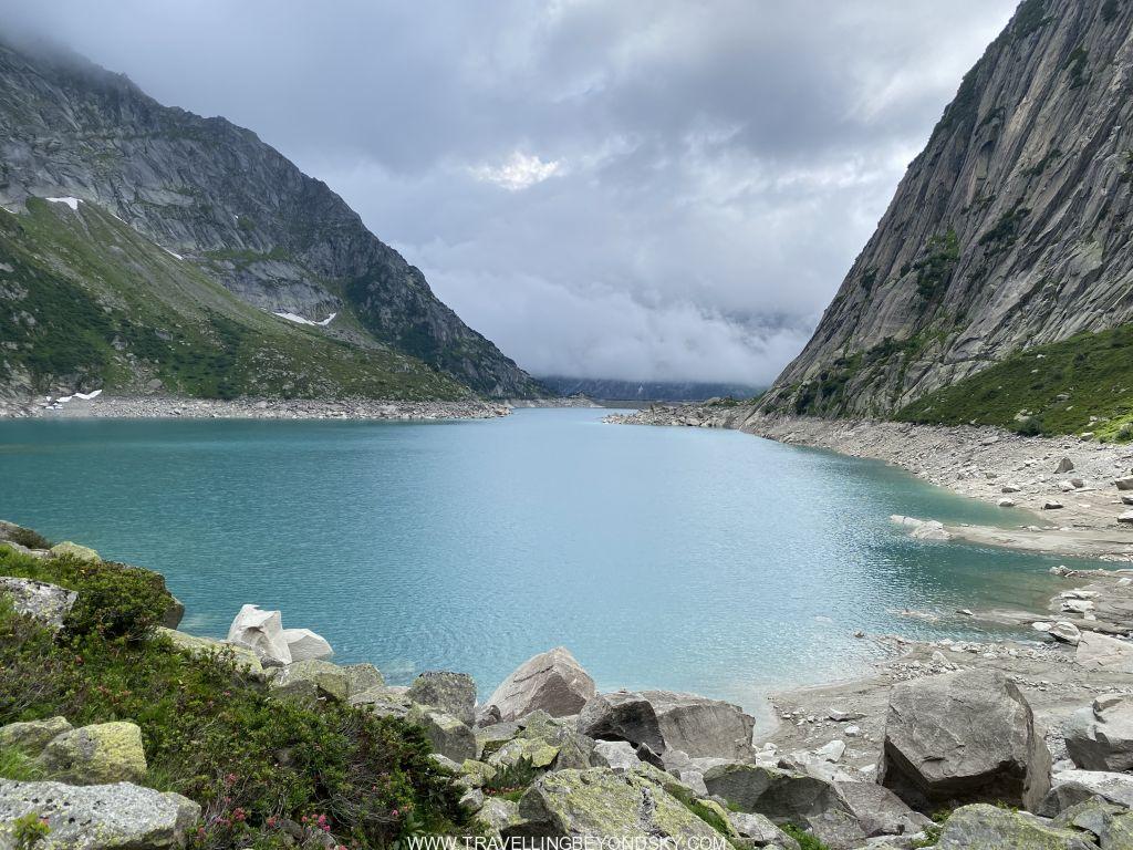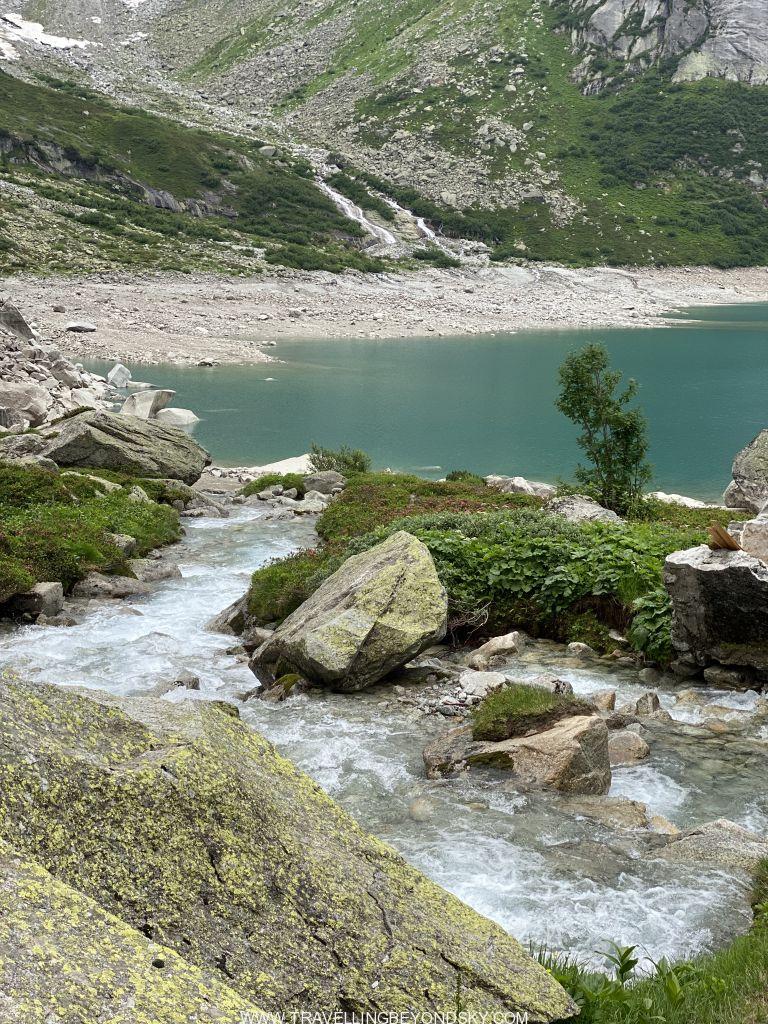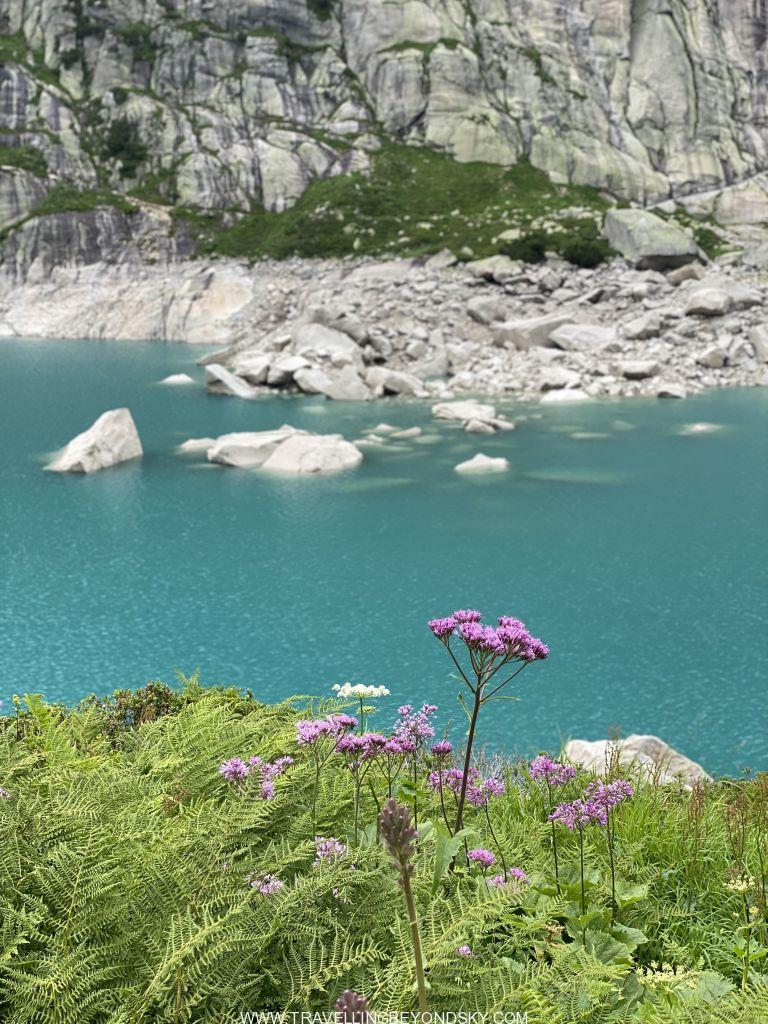 พอถึงข้างบนปุ๊บก็แทบจะเห็นน้ำสีฟ้าอมเขียวสุดสวยของทะเลสาบ Gelmersee ทันที หลายคนเดินไปชมวิวที่สันเขื่อนแลฃ้วก็นั่งรถรางกลับ แต่เราต้องเดินรอบทะเลสาบให้ครบรอบ โดยเราเลือกเดินตามเข็มนาฬิกา เพราะชอบเริ่มยากจบง่ายดีกว่า แต่จะว่าไปเส้นทางเดินนี้ไม่โหดมากนัก ไม่ได้ขึ้นๆลงๆเยอะ และมีหินแบนๆปูให้เหยียบไม่ยาก มีหลายช่วงที่ต้องข้ามลำธารที่ไหลเป็นสายน้ำตกลงมาจากภูเขา และมีทางแคบๆชิดติดไหล่เขาให้พอหวาดเสียวหลายช่วง เดินไปได้เห็นน้ำสีสวยไปตลอดเส้นทาง ต้นไม้ใบหญ้าและดอกไม้ป่าก็สวยมากๆ