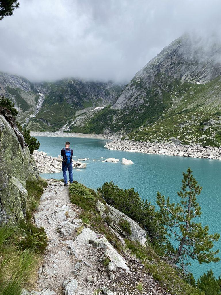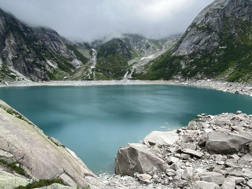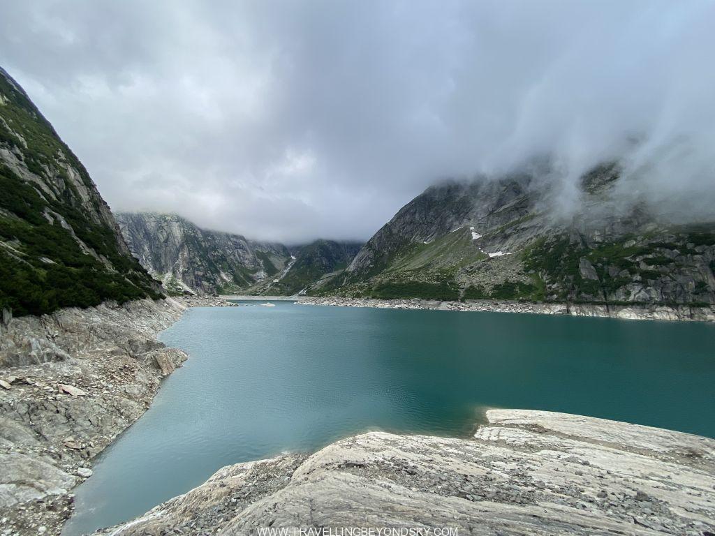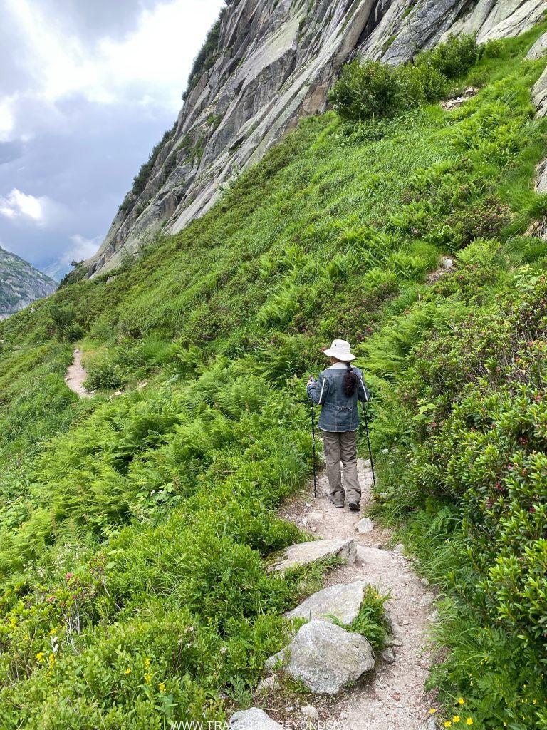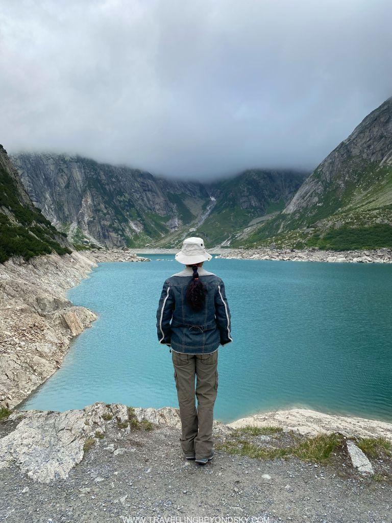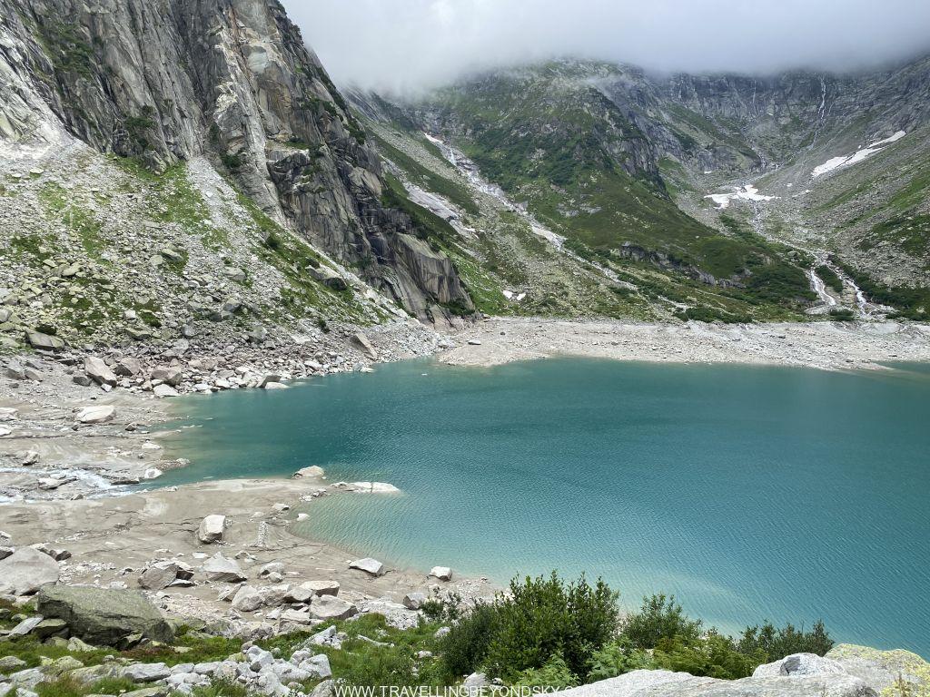 พอถึงข้างบนปุ๊บก็แทบจะเห็นน้ำสีฟ้าอมเขียวสุดสวยของทะเลสาบ Gelmersee ทันที หลายคนเดินไปชมวิวที่สันเขื่อนแลฃ้วก็นั่งรถรางกลับ แต่เราต้องเดินรอบทะเลสาบให้ครบรอบ โดยเราเลือกเดินตามเข็มนาฬิกา เพราะชอบเริ่มยากจบง่ายดีกว่า แต่จะว่าไปเส้นทางเดินนี้ไม่โหดมากนัก ไม่ได้ขึ้นๆลงๆเยอะ และมีหินแบนๆปูให้เหยียบไม่ยาก มีหลายช่วงที่ต้องข้ามลำธารที่ไหลเป็นสายน้ำตกลงมาจากภูเขา และมีทางแคบๆชิดติดไหล่เขาให้พอหวาดเสียวหลายช่วง เดินไปได้เห็นน้ำสีสวยไปตลอดเส้นทาง ต้นไม้ใบหญ้าและดอกไม้ป่าก็สวยมากๆ