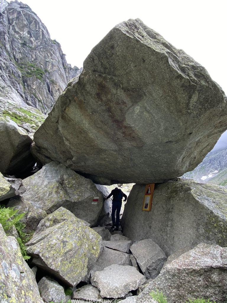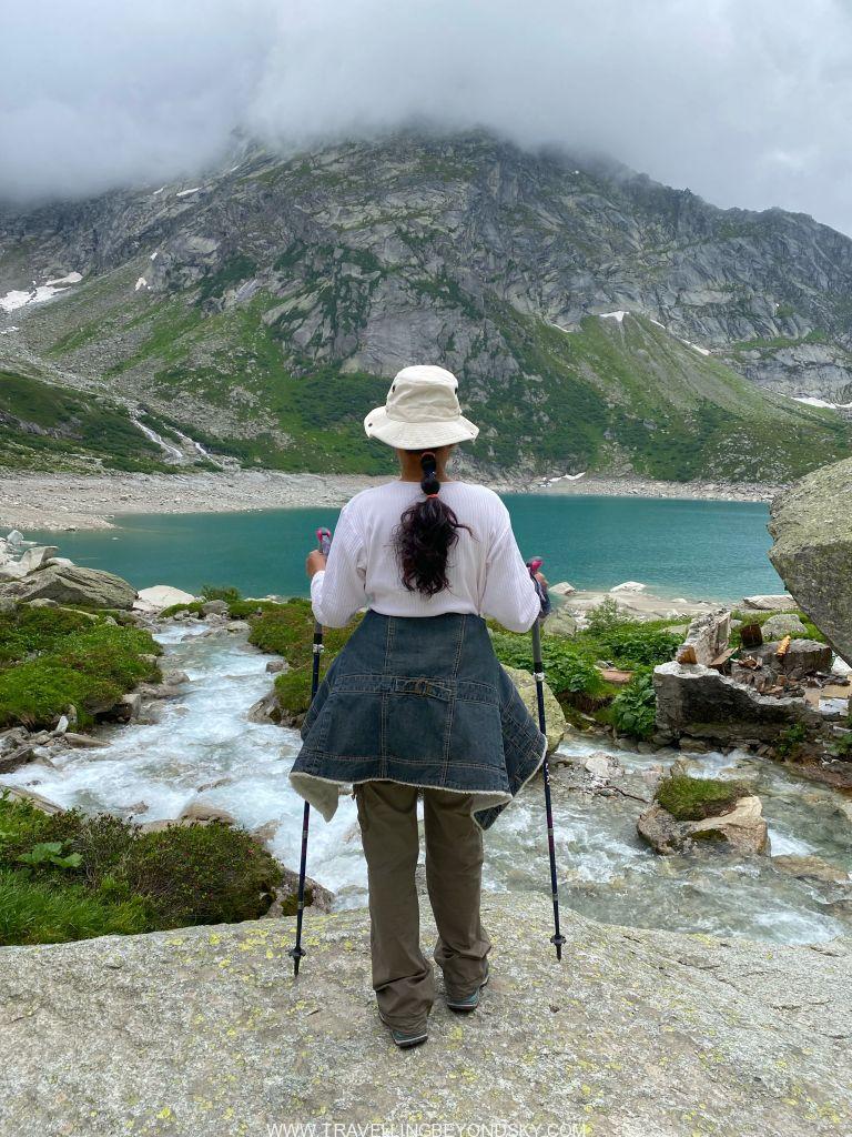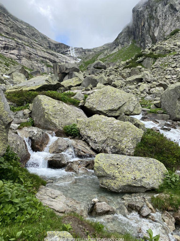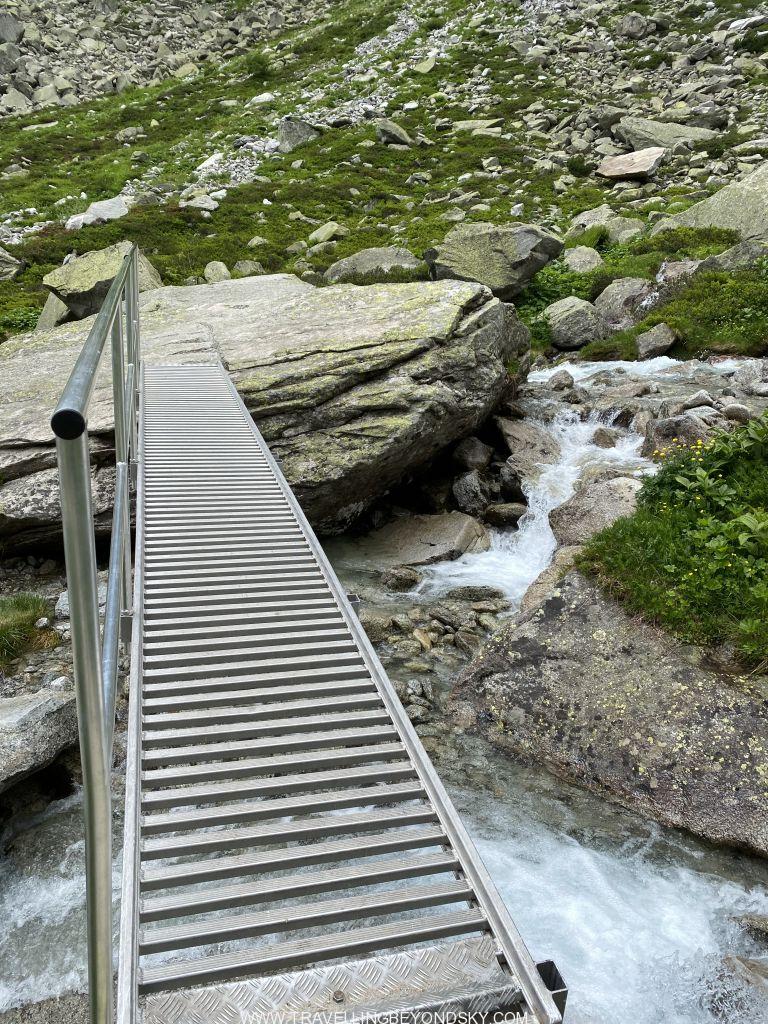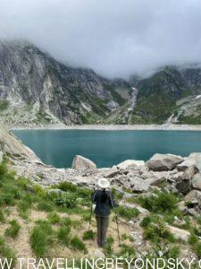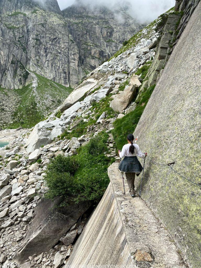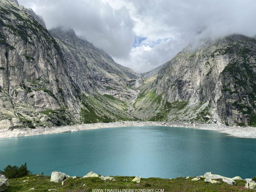 พอถึงข้างบนปุ๊บก็แทบจะเห็นน้ำสีฟ้าอมเขียวสุดสวยของทะเลสาบ Gelmersee ทันที หลายคนเดินไปชมวิวที่สันเขื่อนแลฃ้วก็นั่งรถรางกลับ แต่เราต้องเดินรอบทะเลสาบให้ครบรอบ โดยเราเลือกเดินตามเข็มนาฬิกา เพราะชอบเริ่มยากจบง่ายดีกว่า แต่จะว่าไปเส้นทางเดินนี้ไม่โหดมากนัก ไม่ได้ขึ้นๆลงๆเยอะ และมีหินแบนๆปูให้เหยียบไม่ยาก มีหลายช่วงที่ต้องข้ามลำธารที่ไหลเป็นสายน้ำตกลงมาจากภูเขา และมีทางแคบๆชิดติดไหล่เขาให้พอหวาดเสียวหลายช่วง เดินไปได้เห็นน้ำสีสวยไปตลอดเส้นทาง ต้นไม้ใบหญ้าและดอกไม้ป่าก็สวยมากๆ