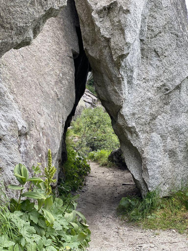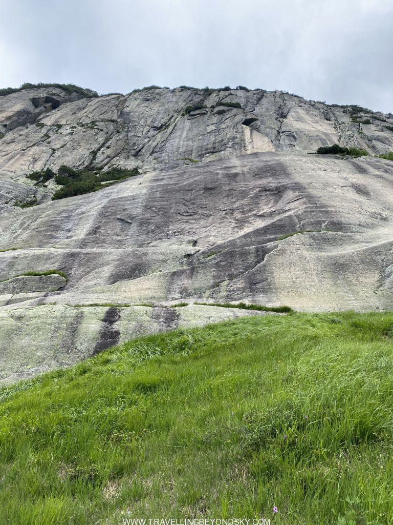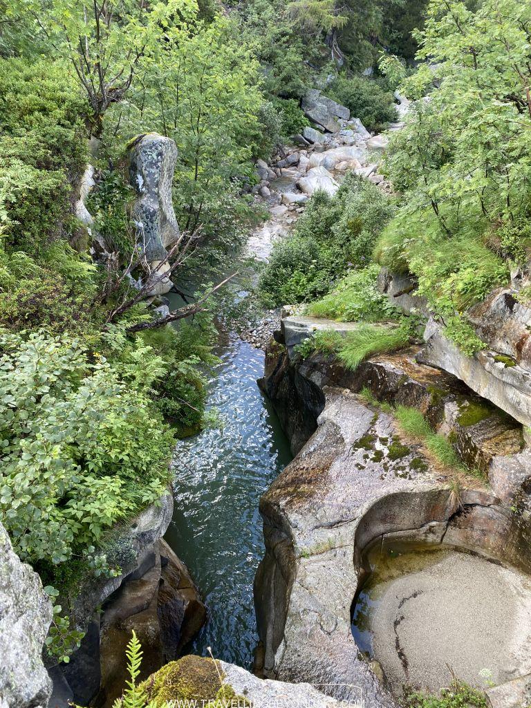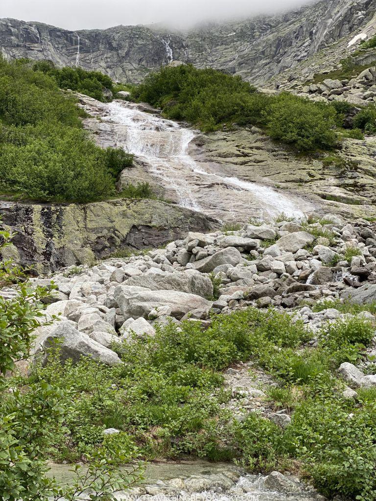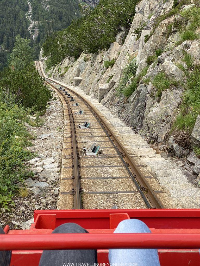 เดินครบรอบทะเลสาบชมวิวจนจุใจใช้เวลาไป 3 ชั่วโมงครึ่ง แต่ยังไม่พอ แทนที่จะนั่งรถรางกลับลงมา เราเดินลงอีก 2 ชั่วโมง ทีนี้ไต่ดิ่งลงชันเลย เพราะเราขึ้นไปสูงมากๆ แต่ทางมีปูเป็นบันไดหินให้ส่วนมากเลยไม่ต้องกลัวไถลกลิ้งลงมา พอมาถึงถนนด้านล่างก็มีป้ายรถเมล์พอดี นักเดินบางคนจะขึ้นรถเมล์ย้อนไปที่จอดรถตรงสถานีรถรางได้ แต่เราเดินต่ออีก ลุยเข้าป่าอีกฝั่งของถนนเข้าไปอีก ได้เห็นภูเขาหินโล้นเกลี้ยง ภูมิทัศน์แปลกไปจากเดิม น่าจะเป็นผลของธารน้ำแข็งในยุคดึกดำบรรพ์ มีน้ำตกและลำธารที่มีเซาะจนเป็นโตรกผาด้วย