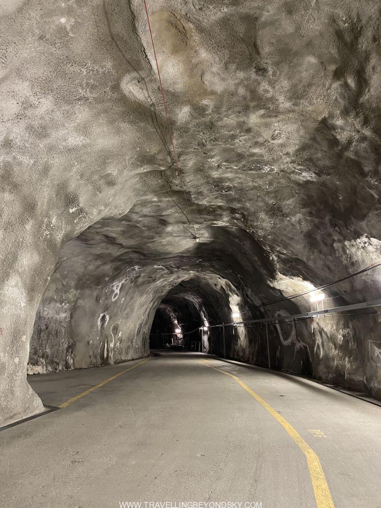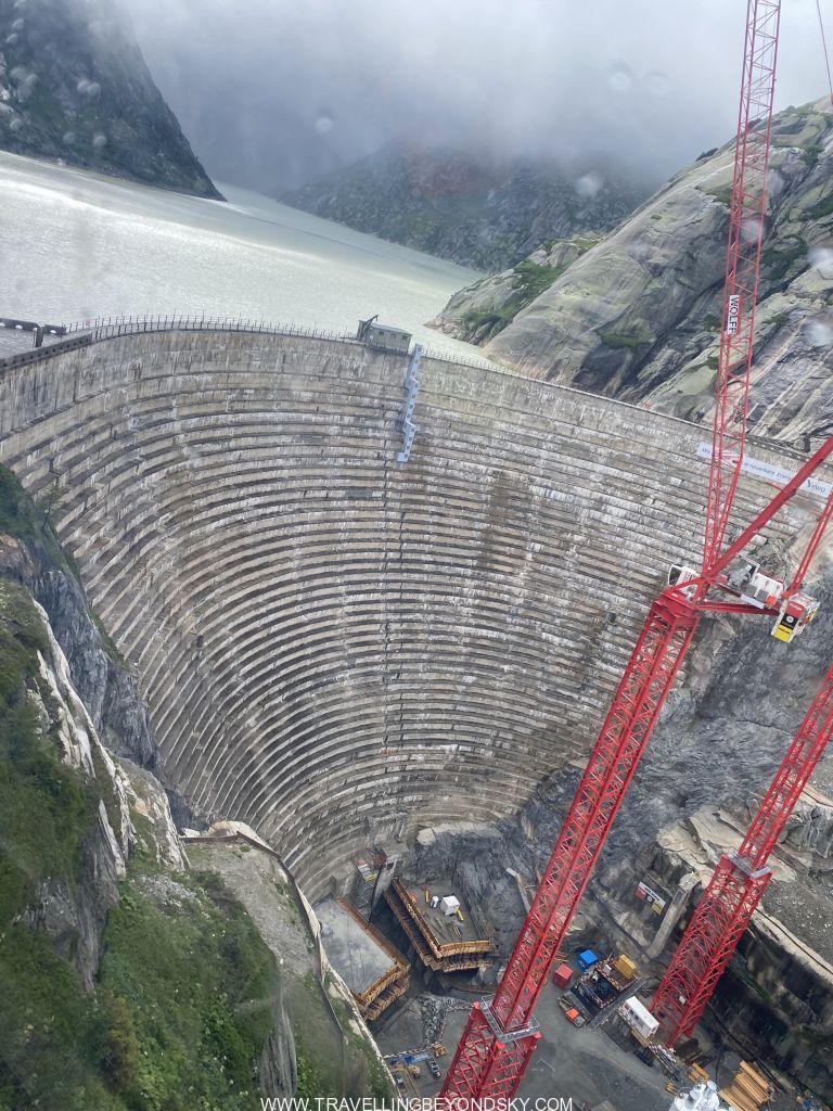 จากจุดนัดพบ คุณลุงไกด์ให้เราชมภาพนิทรรศการที่จัดแสดงดูก่อนเพื่อความเข้าใจเบื้องต้น จากนั้นจึงพาเราขึ้นกระเช้าแบบที่ใช้บนเนินสกีพาเราลอยข้ามเขาไปที่สถานีอีกฝั่งตรงจุดที่ต่ำลงไป กระเช้าอันนี้มีความพิเศษตรงที่ไม่มีคนบังคับ แต่ใครเข้าไปแล้วก็จะกดปุ่มบังคับให้มันเดินทางได้เองเหมือนกดลิฟต์ หนึ่งกระเช้านั่งได้แปดคน ใช้เวลา 2นาทีกว่าก็ลอยไปถึงสถานีอีกฝั่ง ระหว่างนั้นเราเห็นผนังกำแพงสูงของเขื่อน Spitallamm จากด้านบนที่กั้นน้ำอยู่เต็มขวางระหว่างช่องแคบของสองเขาต่ำลงมาถึงด้านล่าง ใหญ่โตอลังการ ดูแล้วก็ทึ่งจริงๆว่ามนุษย์สามารถเอาชนะธรรมชาติได้ขนาดนี้ เขื่อนนี้เขากำลังสร้างผนังเขื่อนอันที่สองทดแทนอันเก่าที่เริ่มจะเสียหาย จึงเห็นไซท์ก่อสร้างที่กำลังทำงานอยู่ แลดูน่าทึ่งจริง พอมาถึงสถานีอีกฝั่งหนึ่งแล้วเราก็เดินลงบันไดไปใต้ดินลึกมาก จากนั้นก็เป็นถนนแคบๆเหมือนอยู่ในถ้ำ คุณลุงพาขึ้นรถแล้วขับไปตามถนนนี้ เหมือนเป็นการขับรถไปในอุโมงค์ใต้ดินเป็นระยะทางยาวหลายกิโลเมตรทีเดียว คุณลุงบอกว่าขณะที่เราขับอยู่นี้เราอยู่ใต้ทะเลสาบแล้ว และถนนนี้ยาวไปทะลุถึงเมือง Innertkirchen ซึ่งเป็นที่ตั้งของบริษัท Kraftwerke Oberhasli หรือ KWO ผู้ผลิตกระแสไฟฟ้าแจกจ่ายไปนั่นเอง มันช่างน่าอัศจรรย์มากที่มนุษย์สามารถเจาะภูเขาลงไปลึกถึงใต้ดินใต้ทะเลสาบหลายแห่ง ใช้เป็นเส้นทางเดินทางที่เชื่อมกับเมืองด้านนอก และยังใช้เป็นที่ทำการควบคุมการผลิตกระแสไฟฟ้าอีกด้วย