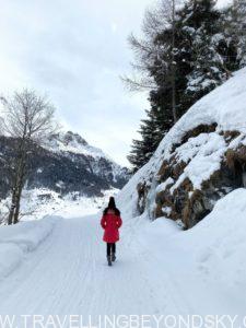 เดินชมในตัวหมู่บ้านแล้วก็ต้องจัดเส้นทางการเดินออกกำลังบนภูเขาที่สูงเหนือหมู่บ้านขึ้นไป เพื่อที่จะได้สำรวจและชมวิวหมู่บ้านจากข้างบนกัน ฉันเคยไปทั้งฤดูหนาวที่หิมะท่วมหัวท่วมหูกับฤดูร้อน เส้นทางสำหรับเดินเขาในฤดูหนาวนั้นดีมากๆ เป็นเส้นทางเล็กๆจากหมู่บ้านด้านล่างไต่ไปจนถึงด้านบนสูงขึ้นไปประมาณ 300 เมตร เป็นระยะทางทั้งหมด 8 กิโลเมตร ใช้เวลาประมาณ 3 ชั่วโมง แล้ววนกลับลงมาหมู่บ้านอีกด้านหนึ่ง ตลอดทางมีป้ายสีเหลืองที่มีรูปหิมะบนวงกลมสีแดงชี้บอกทางเป็นสัญลักษณ์ของเส้นทางการเดินเป็นระยะ แสดงว่าเป็นเส้นทางแนะนำยอดนิยมทีเดียว แต่ตอนที่เราไปนี้เงียบเชียบแทบไม่มีคนเลย เส้นทางแคบยาวที่เราเดินนี้เหมาะมากสำหรับการแล่นเลื่อนหิมะไหลลงมาจากบนเขา เราจึงได้เห็นเด็กวัยรุ่นและครอบครัวที่มีเด็กเล็กแล่นเลื่อนสวนลงมาอย่างสนุกสนานบ้าง คาดว่าในสถานการณ์ปกติคงเปรียบเสมือนเป็นไม้ลื่นสวนสนุกที่แล่นเลื่อนกันได้อย่างสนุกสะใจทีเดียวเพราะยาวหลายกิโลเมตรเลย และก็ยังมีคนเดินออกกำลังไต่เขาบนหิมะหนาลัดไปตามป่าด้วยสโนว์ชูกันบ้างสองสามคน สังเกตดูกิจกรรมเหล่านี้เป็นกิจกรรมของคนในหมู่บ้านท้องถิ่นล้วน ไม่ได้เป็นเส้นทางยอดฮิตที่นักท่องเที่ยวมากัน ซึ่งมันน่าทึ่งมากที่เราเห็นได้คนที่มีวิถีชีวิตแบบนี้อยู่กับธรรมชาติ และมีกิจกรรมสนุกๆได้อย่างที่ไม่ต้องเสียเงินเลย