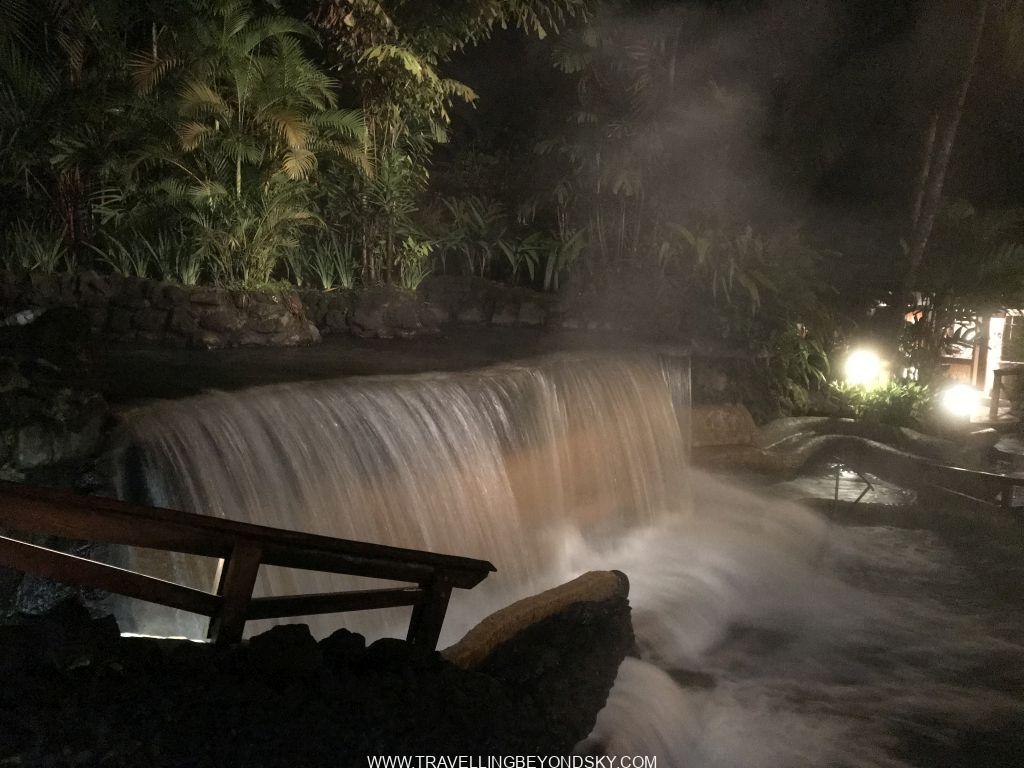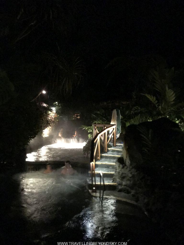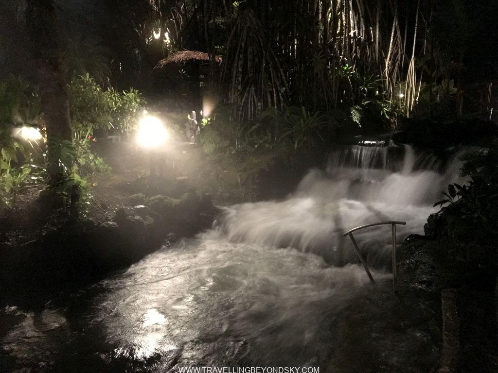 แต่หลังจากเหนื่อยโฮกมาทั้งวัน เราก็ได้จบวันอย่างสวยๆ โดยไปแช่น้ำในแม่น้ำ เป็นน้ำร้อนธรรมชาติ กลางแม่น้ำเป็นเหมือนเกาะแก่งให้น้ำตกลงมาเป็นสายคล้ายน้ำตกที่ตกลงกลางบ่อ อุ่นสบายคลายกล้าเนื้ออย่างมาก และได้ล้างโคลนออกทั้งตัว ตอนฉันยืนแช่น้ำอยู่ข้างหน้าสายน้ำที่ตกลงมาเป็นแผ่น อยู่ดีๆ มีอะไรไม่รู้มาโดนขาที่อยู่ใต้น้ำ ตอนแรกตกใจว่าใครมาดึงขา ปรากฎมีฝรั่งคนหนึ่งโผล่มาจากใต้น้ำ พอเขาเห็นฉันตกใจเลยบอกว่า เขาโผล่มาจากหลังม่านน้ำตกนั้น บอกว่าให้เราดำใต้น้ำผ่านม่านน้ำตกเข้าไป ด้านในเป็นถ้ำให้นั่งได้ เราเลยดำมุดเข้าไป พอโผล่ขึ้นมา อัยยะ ฝรั่งกลุ่มโตนั่งแช่น้ำปาร์ตี้ถือแก้วเหล้าคนละใบล้อมวงกันอยู่เต็ม ชอบมาก มันเป็นโพรงถ้ำหลังม่านน้ำ เหมือนห้องลับ สุดยอดมากๆ เลยขอร่วมวงปาร์ตี้ด้วยเสียเลย
