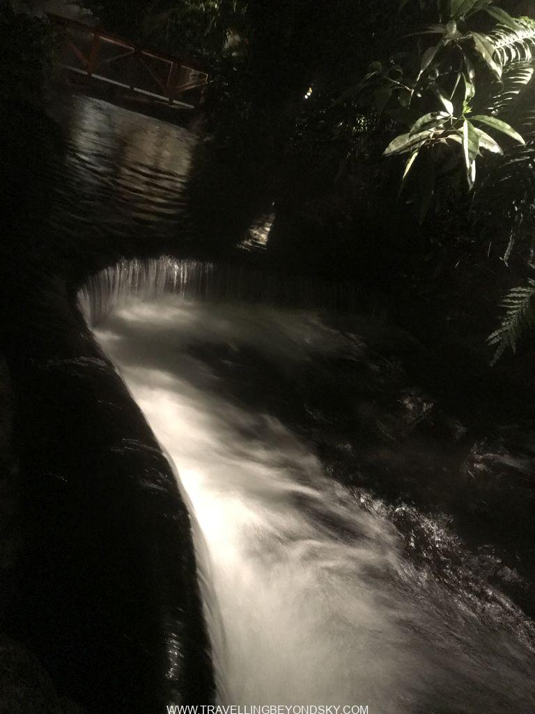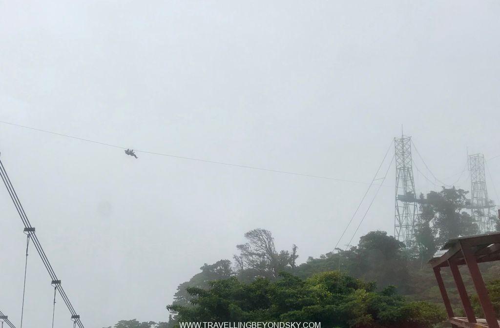 ทีเด็ดอีกอย่างคือ Zip lining ที่นี่ เพราะเป็นการเดินไปในป่า ขึ้น Sky tram ไปตามแต่ละสถานี ทั้งหมด 6 สถานี แล้วโรยตัวบนสลิงข้ามหุบเขาเป็นลูกๆไปเลย ยิ่งสูงยิ่งมัน เพราะเมฆหนามาก มันคือการโรยตัวแบบทาร์ซานทะลุผ่านเข้าไปในเมฆ เป็นประสบการณ์แปลกสุดๆ คือมันขาวมองไม่เห็นอะไรเลย เราพุ่งเข้าไปในก้อนเมฆขาว ไม่รู้จะมีอะไรข้างหน้า ข้อดีคือมันไม่เห็นพื้นเลยไม่หวาดเสียว พอเข้าไปในเมฆมันเปียกมาก เหมือนทะลุผ่านพายุฝนด้วยความเร็วสูง เปียกไปหมด ทั้งหมดใช้เวลาประมาณชั่วโมงหนึ่ง สะใจมาก พอถึงฐานสุดท้าย ปรากฏเป็นการโดดหอแบบ Free fall แต่จะไม่เด้งขึ้นอย่างบันจี้จั๊มพ์ เขาจะเบรคให้ แล้วปล่อยตัวลงพื้นเลย เหมือนโดด Sky dive มากกว่า อันนี้ปกติฉันกลัว แต่ทำไมไม่รู้เมื่อวานไม่กลัว เดินขึ้นไปเฉยๆ เลย พอมองลงมาก็ไม่เสียว ฝรั่งผู้ชายยังขอบายหลายคน ฉันโดดลงมาเลยชิลๆ พอโดดจริงพบว่ามันยิ่งไม่น่ากลัวเลย แป๊บเดียวเอง แหมไม่สะใจ