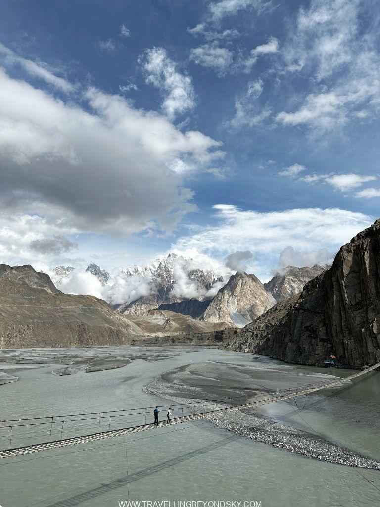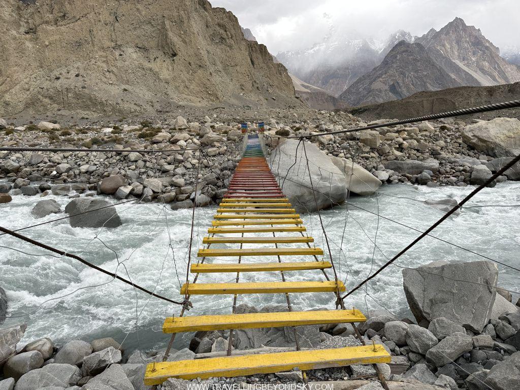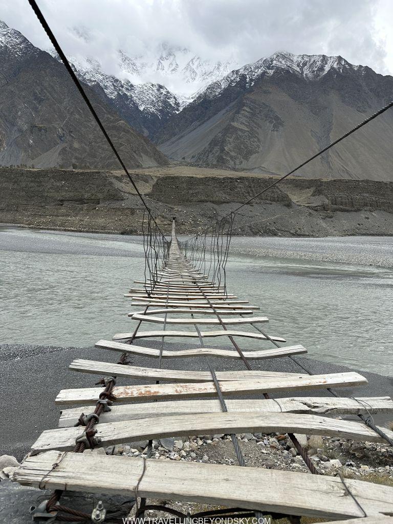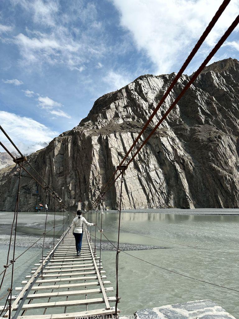 เรามีแผนเดินบนเขาวันนี้เป็นเวลา 4 ชั่วโมง แต่ก่อนจะเริ่มเดินต้องข้ามสะพานแขวนแห่งแรก คือ Hussaini Suspension Bridge เสียก่อน เพราะเราจะต้องไปเดินอีกฝั่งของแม่น้ำ Hunza สะพานแขวนแห่งนี้มีความยาวถึง 250 เมตร พื้นเป็นแผ่นไม้กระดานวางบนลวดสลิง โดยไม่ได้วางชิดกัน แต่ละแผ่นเว้นห่างๆ มองทะลุลงไปเห็นแม่น้ำข้างล่างอยู่ลิบลิ่วเหมือนแกล้งให้หวาดเสียวเล่นอย่างนั้นแหละ แถมยังแกว่งโยนอีก ฉันต้องจับลวดที่ราวไว้แน่นแล้วเดินไปทีละแผ่นๆ อย่างตั้งใจมากๆ