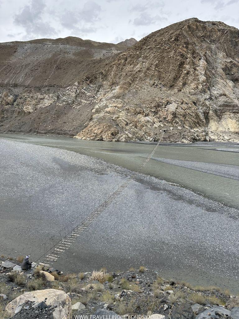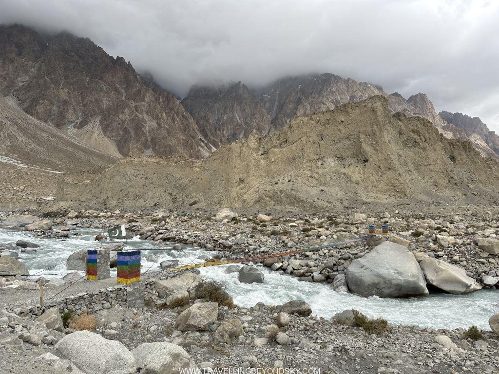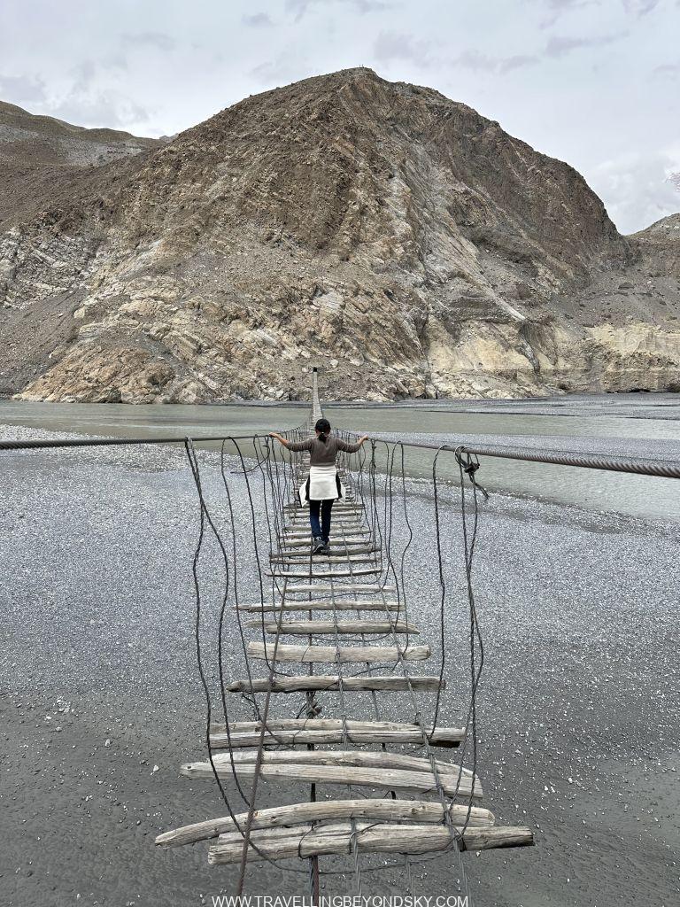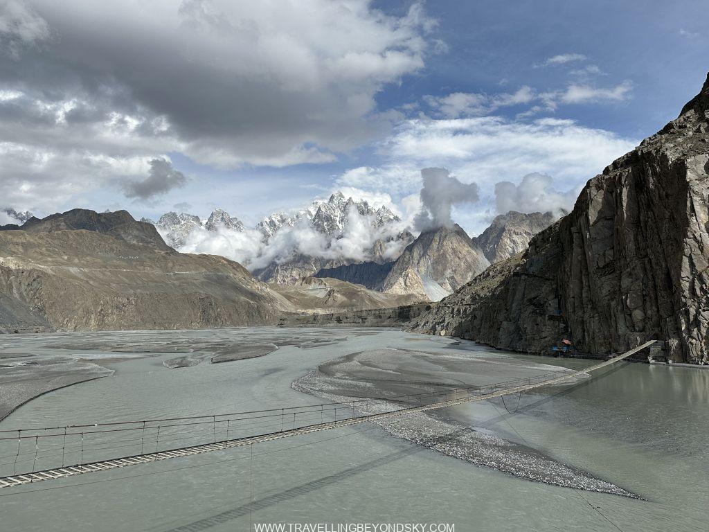 เรามีแผนเดินบนเขาวันนี้เป็นเวลา 4 ชั่วโมง แต่ก่อนจะเริ่มเดินต้องข้ามสะพานแขวนแห่งแรก คือ Hussaini Suspension Bridge เสียก่อน เพราะเราจะต้องไปเดินอีกฝั่งของแม่น้ำ Hunza สะพานแขวนแห่งนี้มีความยาวถึง 250 เมตร พื้นเป็นแผ่นไม้กระดานวางบนลวดสลิง โดยไม่ได้วางชิดกัน แต่ละแผ่นเว้นห่างๆ มองทะลุลงไปเห็นแม่น้ำข้างล่างอยู่ลิบลิ่วเหมือนแกล้งให้หวาดเสียวเล่นอย่างนั้นแหละ แถมยังแกว่งโยนอีก ฉันต้องจับลวดที่ราวไว้แน่นแล้วเดินไปทีละแผ่นๆ อย่างตั้งใจมากๆ