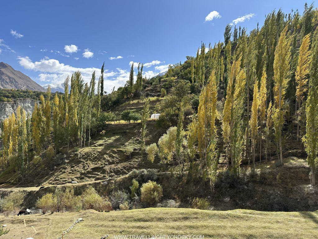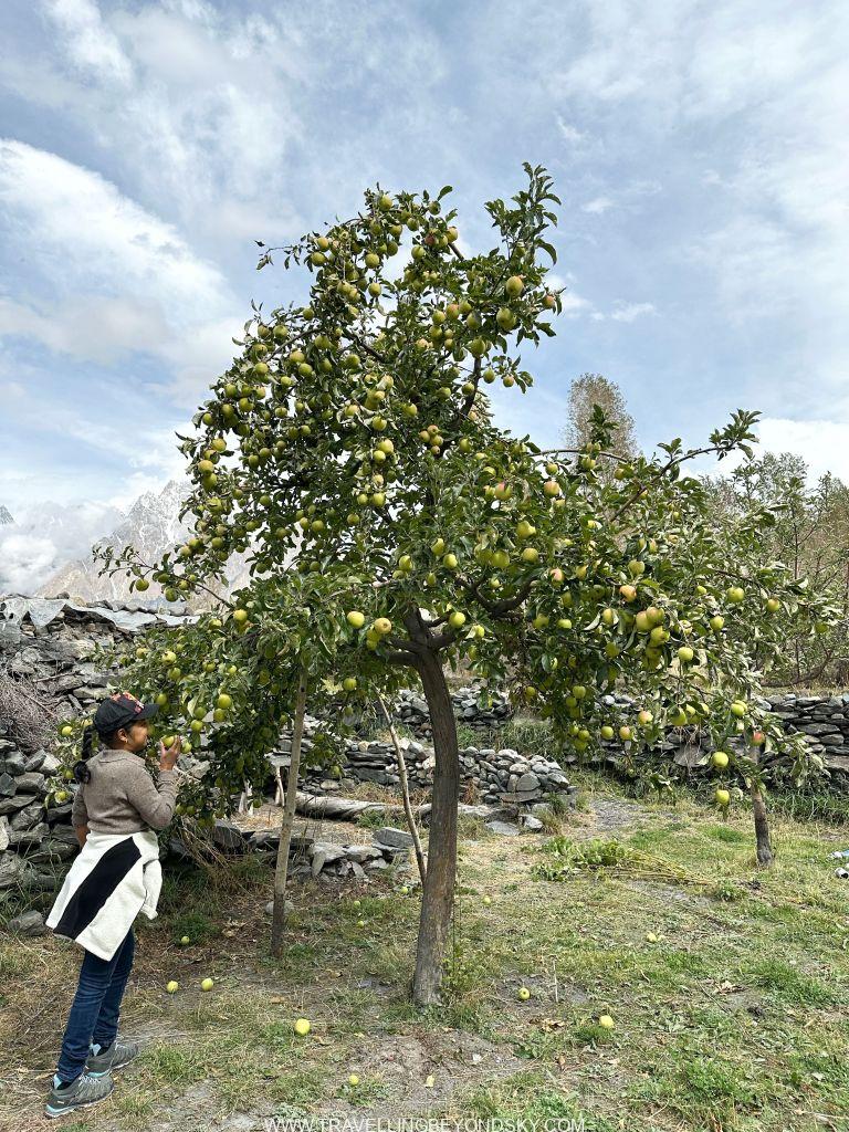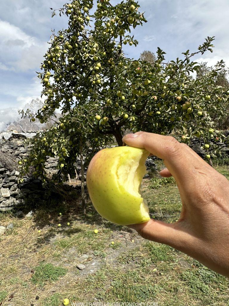 ข้ามไปแล้วก็เดินเลาะไปตามทางริมผาสูงสักพัก แล้ววกเข้าสู่ทุ่งและสวนที่ชาวบ้านมาปลูกแอปเปิ้ล ข้าวสาลี และเก็บไม้ไปทำฟืน ไกด์ชวนเก็บแอปเปิ้ลกินจากต้น บอกว่าเป็นสวนของญาติเขาเอง โอ้โหฉันไม่เคยกินแอปเปิ้ลเขียวอะไรอร่อยขนาดนี้ กรอบมากๆ และหวานกำลังดี ที่สำคัญออร์แกนิคจริงๆ เพราะเขาปลูกแบบธรรมชาติแท้ ไม่มีการใส่ปุ๋ยหรือกระบวนการใดๆ