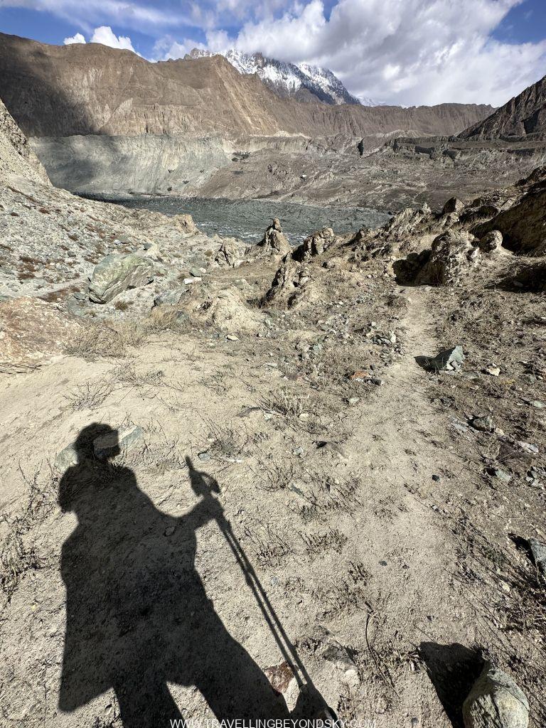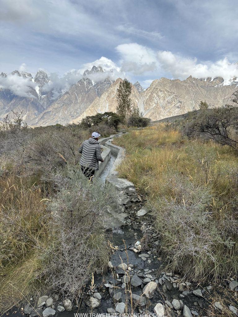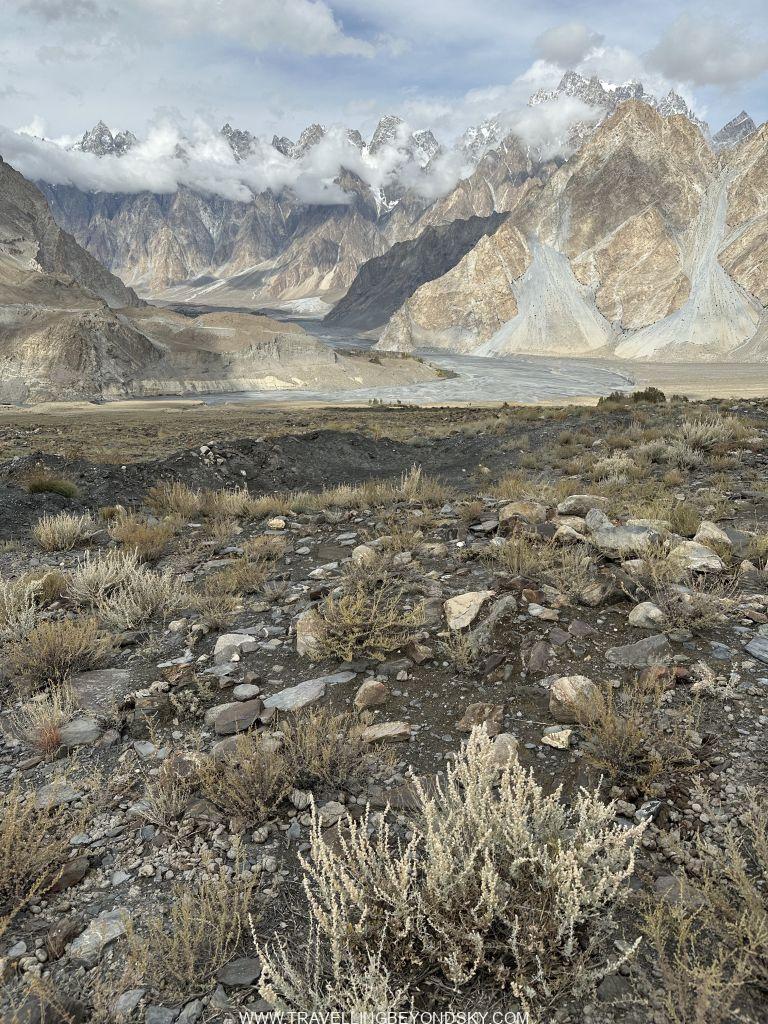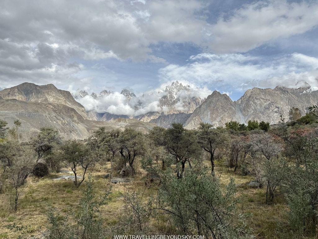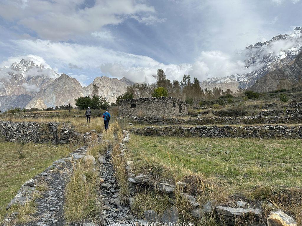 ไม่น่าเชื่อว่าบนภูเขาสูงลิ่วที่เรามองมาจาก Karakoram Highway เมื่อวานจะมีทุ่งมีสวนซุกอยู่ด้านใน เพราะมองไปโดยรอบมีแต่ภูเขาสูงตระหง่านเตียนโล่ง สำหรับเส้นทางเดินเขาเส้นนี้ พิเศษมากตรงที่เรามองเห็นยอดเขา Passu Cones หรือบางคนเรียก Cathedral Spires ตลอดทั้ง 4 ชั่วโมงที่เดิน อิ่มจุกๆ ไปเลย และตอนชั่วโมงสุดท้ายยังเห็น Passu Glacier ที่เราเดินไปชมมาเมื่อวานโผล่มาให้เห็นอีกด้วย สวยมาก