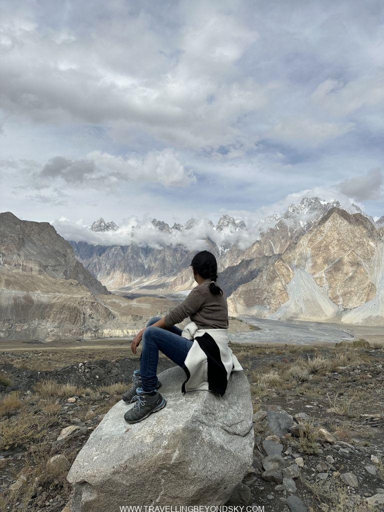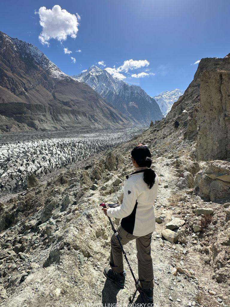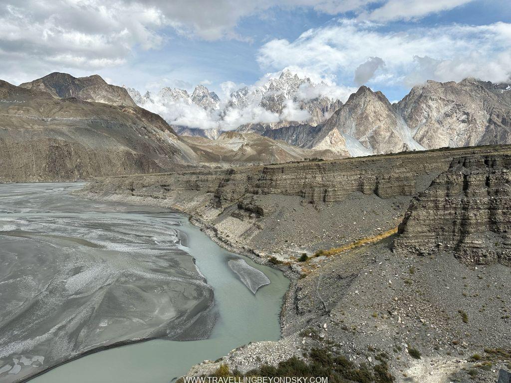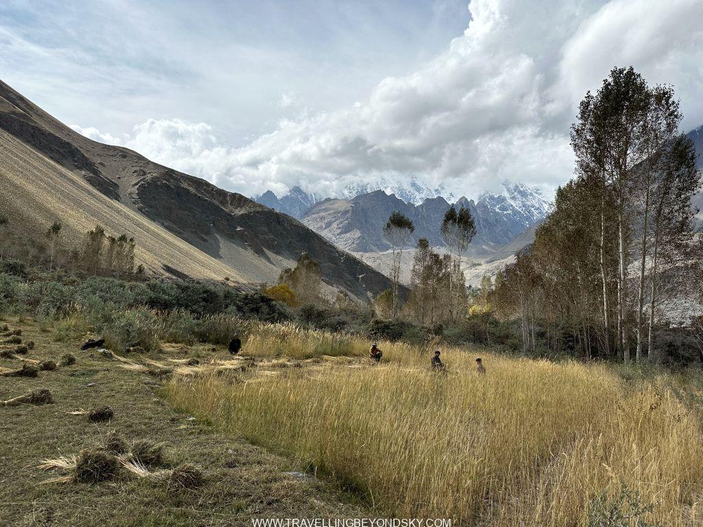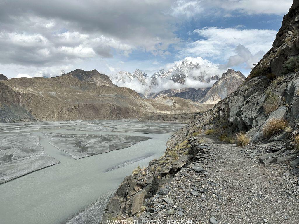 ไม่น่าเชื่อว่าบนภูเขาสูงลิ่วที่เรามองมาจาก Karakoram Highway เมื่อวานจะมีทุ่งมีสวนซุกอยู่ด้านใน เพราะมองไปโดยรอบมีแต่ภูเขาสูงตระหง่านเตียนโล่ง สำหรับเส้นทางเดินเขาเส้นนี้ พิเศษมากตรงที่เรามองเห็นยอดเขา Passu Cones หรือบางคนเรียก Cathedral Spires ตลอดทั้ง 4 ชั่วโมงที่เดิน อิ่มจุกๆ ไปเลย และตอนชั่วโมงสุดท้ายยังเห็น Passu Glacier ที่เราเดินไปชมมาเมื่อวานโผล่มาให้เห็นอีกด้วย สวยมาก