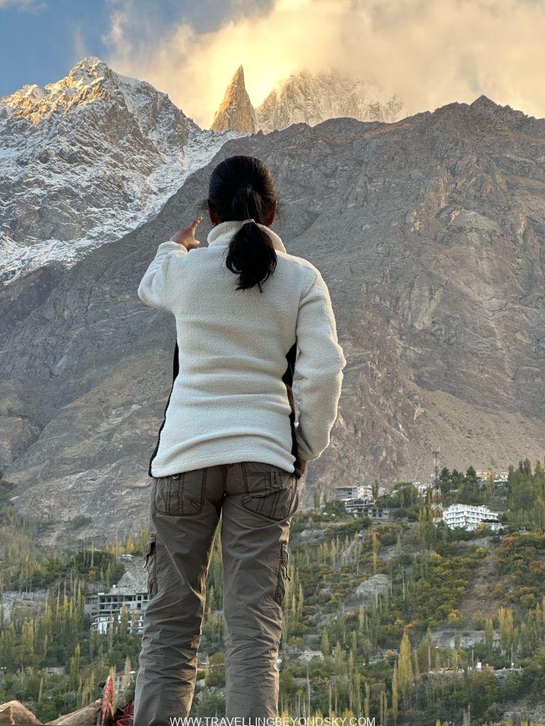ตกเย็นเราขับรถจาก Nagar Valley ออกมาเพื่อจะไปพักที่เมือง Gilgit พอผ่าน Karimabad ก็ได้ดีใจมากๆ เพราะยอดเขา Lady’s Finger ที่ซ่อนตัวอยู่หลังเมฆไม่ยอมให้เราเห็นมา 3 วันนั้น เธอโผล่พ้นเมฆออกมาให้เราชมโฉม รูปร่างเธอนั้นแหลมเรียวเฟี้ยวทีเดียว อยู่สูงเสียดฟ้า และตกกระทบรับแสงแดดสุดท้ายเป็นสีทอง งามวับจับตา เป็นการบอกลา Hunza Valley ได้อย่างสมบูรณ์ที่สุดก่อนที่เราจะออกเดินทางต่อไป