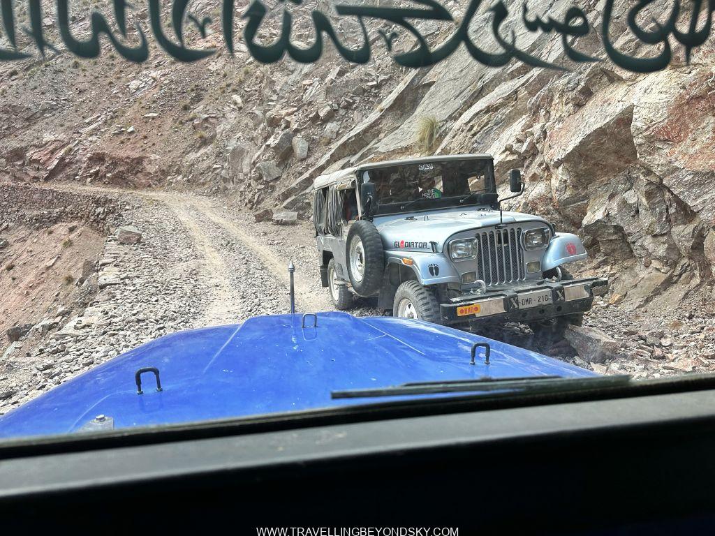 เราขอนั่งข้างหน้าข้างคนขับเพื่อประสบการณ์ขั้นสุด! แล้วให้ไกด์กับคนขับรถของเราไปนั่งเบาะสบายข้างหลังแทน ถนนนอกจากจะเป็นลูกรังผสมหินก้อนโต นั่งไปหัวสั่นหัวคลอนไปแล้ว ยังแคบและเลียบไปบนหน้าผา ยิ่งสูงก็ยิ่งหวาดเสียว แต่คนขับเราขับชำนาญมาก หลายครั้งมีรถจี๊ปคันอื่นสวนมาก็หลบให้สวนกันได้อย่างเนียนมาก แม้บางครั้งจะชิดหน้าผาไปหน่อยก็ตาม แถมยังเปิดเพลงแขกดังลั่น ไกด์กับคนขับเราตบมือเข้าจังหวะเพลงพร้อมตะโกนร้องเพลงกันลั่นอย่างสนุก คนขับจี๊ปก็ผสมโรงตบมือไปด้วยเวลาเข้าท่อนฮุค ฉันอยากจะบอกว่าเอามือไว้บนพวงมาลัยตลอดได้ไหม คุณสามีก็สนุกตบมือร้องเพลงไปกับเขาด้วย หนุ่มๆ สนุกกันมาก รถก็โขยกเขยกไปอย่างกับระบำเข้าจังหวะ ยิ่งหวาดเสียวดนตรีก็ยิ่งเร่งจังหวะเร้าใจเหมือนจะรู้ โอย น่าให้รางวัลออสการ์สาขาดนตรีประกอบภาพยนตร์ยอดเยี่ยมเป็นที่สุด