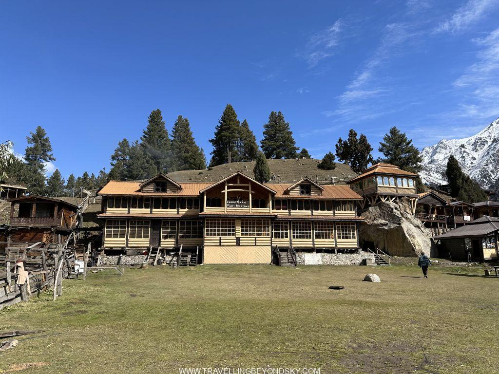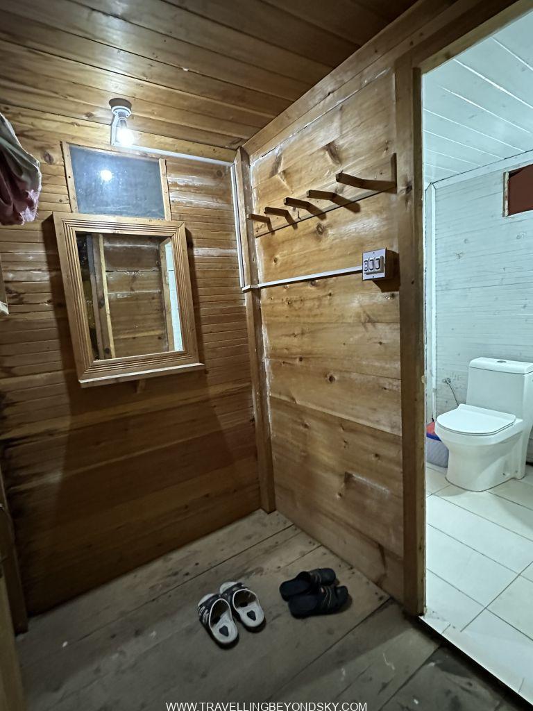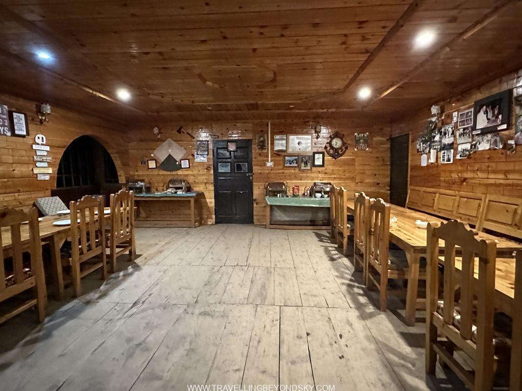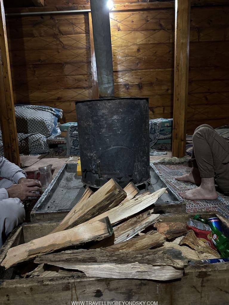 เรามาถึงที่พักด้านบนเขาตอนพระอาทิตย์ตกพอดี พอมืดอากาศก็หนาวทันที น้ำอุ่นมีให้อาบแค่ครึ่งชั่วโมง ห้องนอนไม่มีฮีตเตอร์ ดีที่ห้องนั่งเล่นรวมมีเตาให้ความอบอุ่นตรงกลาง เราอาบน้ำแล้วจึงมาเอกเขนกและกินข้าวเย็นกันที่นี่ ระหกระเหินมาทั้งวันยังไม่ได้เห็น Fairy Meadows เลย ดูสิว่ายากลำบากขนาดไหน พรุ่งนี้เถอะ ได้เจอกันแน่