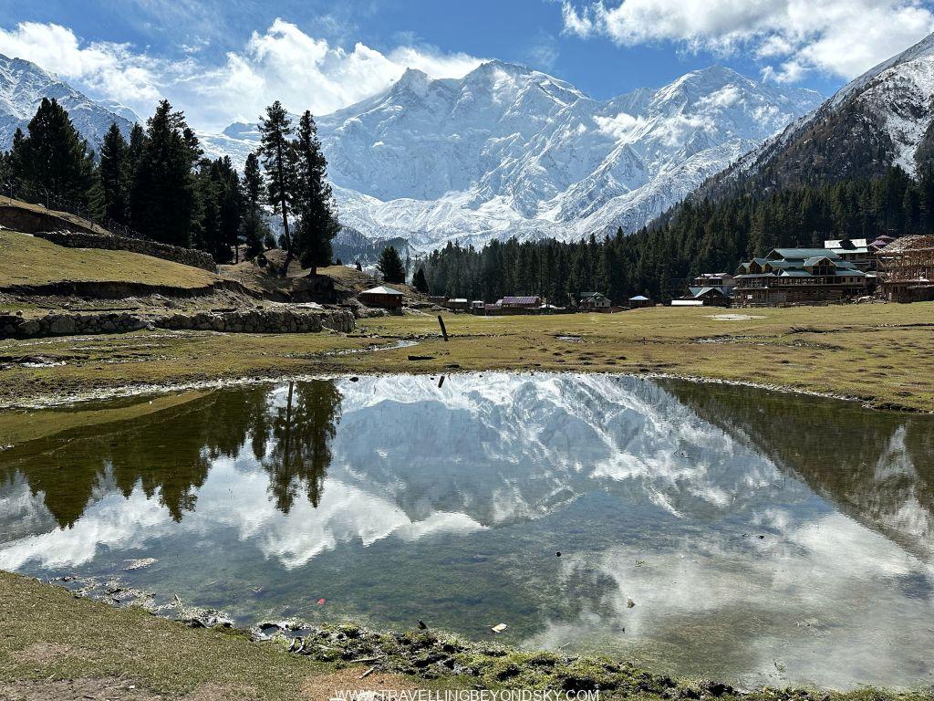 บน Fairy Meadows นี้มีรีสอร์ตหลายแห่งกว่าที่คิด และมีบ้านชาวบ้านอยู่ด้วย เดินไปนิดหนึ่งมีบ่อน้ำจิ๋วที่เรียกกันเสียหรูว่า Reflection lake ตอนแรกฉันนึกว่าเป็นทะเลสาบแต่มันเล็กมากเกินกว่าจะเป็นทะเลสาบ น่าจะแค่บ่อน้ำมากกว่า แต่ความสวยขอมันอยู่ที่มันสะท้อนเงาภูเขาสมชื่อเลยนั่นเอง