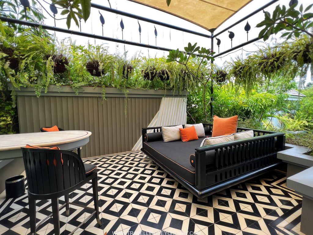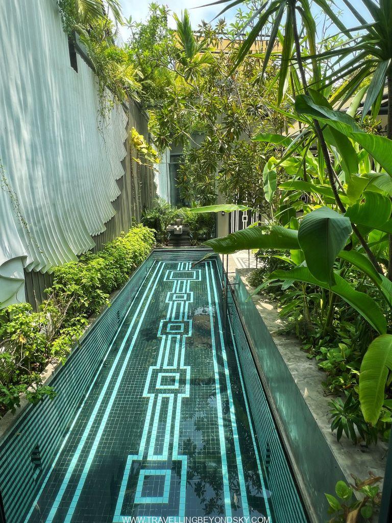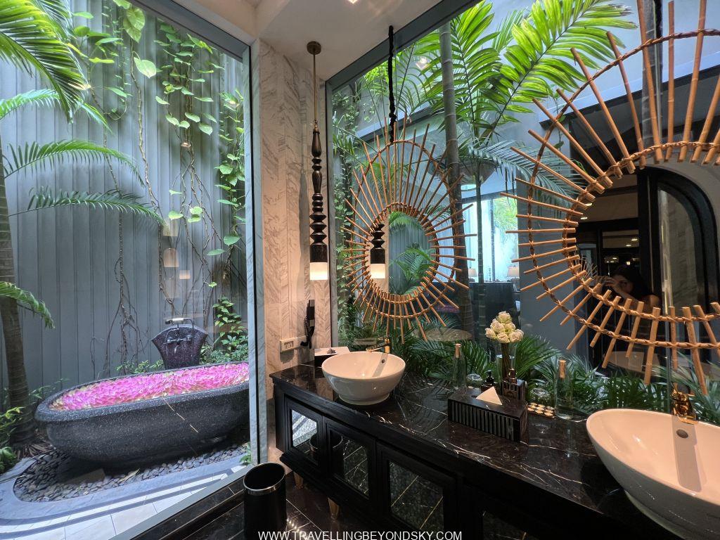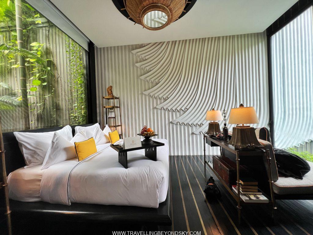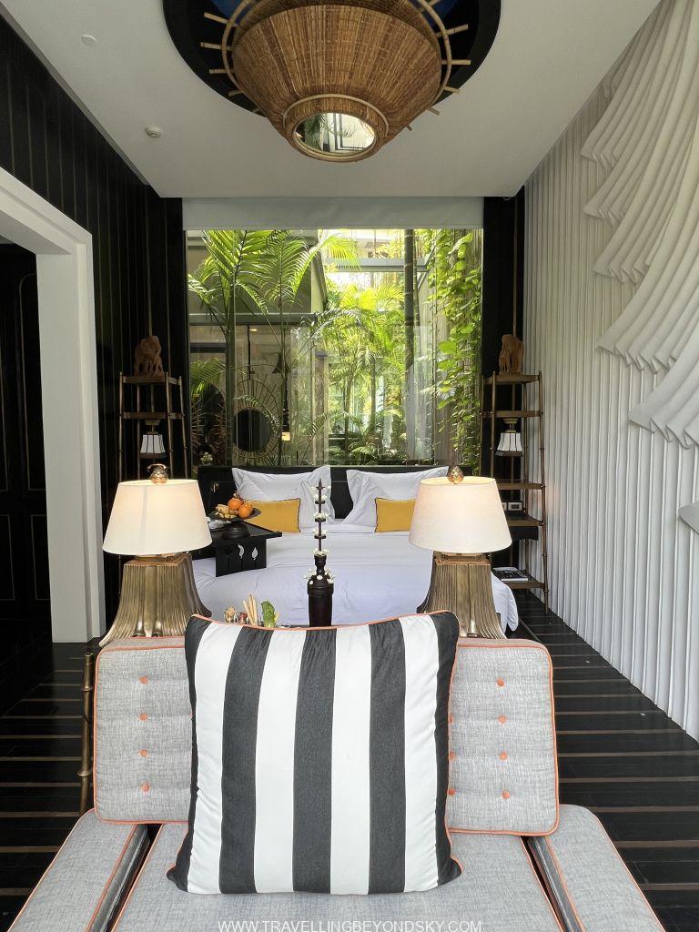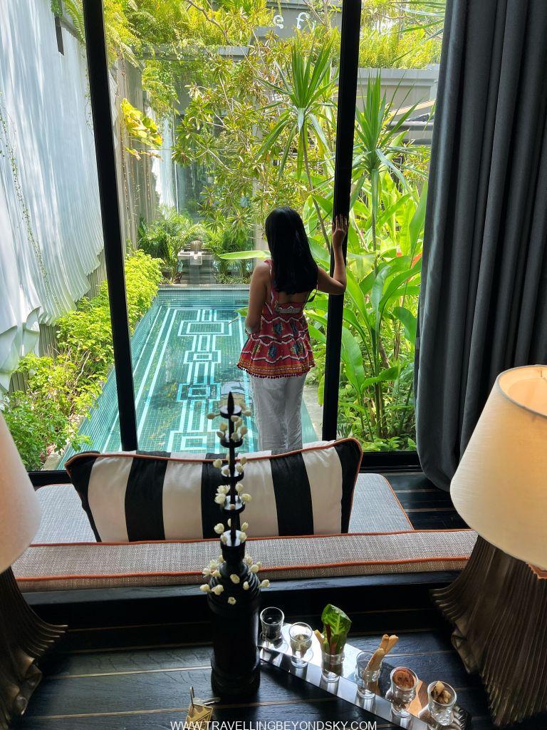 โรงแรมนี้ตั้งอยู่ใจกลางเมือง บริเวณ French Quarter สะดวกมาก และดีไซน์สวยมาก ตั้งแต่เดินเข้าล็อบบี้ไปก็สวยตื่นตาตื่นใจแล้ว ลักษณะการออกแบบเป็นแบบสมัยใหม่ แต่มีการขอยืมดีไซน์ของความเป็นตะวันออกและเขมรมาใช้ ส่วนเรื่องแลนด์สเคปนั้นต้องยกให้เขาอยู่แล้ว ฉันพักห้องพักที่เป็นพูลวิลล่าซึ่งนับว่าเป็นพูลวิลล่าที่สวยที่สุดตั้งแต่เคยพักมาทีเดียว พอเปิดประตูวิลล่าเข้าไปก็จะเป็นส่วนนั่งเล่นริมสระว่ายน้ำแคบยาว สดชื่นทันทีที่ก้าวเข้าไป มีบันไดเดินขึ้นไปบนรูฟท็อปดาดฟ้าด้านบน มีชุดโซฟาให้นั่งนอนดูสบายและเคาน์เตอร์บาร์ เหมาะกับการปาร์ตี้มากๆ ส่วนห้องนอนนั้นอยู่ตรงด้านล่างติดสระว่ายน้ำ ก่อนเข้าห้องมีแพนทรีเตรียมอาหารพร้อมบาร์เครื่องดื่มให้ เปิดเข้าห้องนอนไปก็ต้องตะลึงอีกครั้ง เพราะด้านหนึ่งเป็นกระจกสูงโล่งเห็นสระว่ายน้ำและสามารถเปิดประตูกระโดดลงสระได้ด้วย อีกด้านหนึ่งทางหัวเตียงเป็นกระจกสูงจากเพดานจรดพื้นเช่นกัน มองเห็นสวนในคอร์ทยาร์ดข้างหลัง ในบริเวณห้องนอนนี้มีห้องน้ำอยู่ แต่ส่วนที่จะอาบน้ำจะต้องเปิดประตูผ่านคอร์ทยาร์ดเข้าไปด้านหลัง เป็นส่วนอาบน้ำ ห้องแต่งตัว ห้องเก็บเสื้อผ้า และเปิดออกทะลุไปคอร์ทยาร์ดเล็กด้านหลังอีกส่วนซึ่งมีอ่างอาบน้ำหินรูปไข่ตั้งอยู่ ที่สวยตะลึงก็คือในอ่างอาบน้ำนี้มีกลีบดอกบัวซึ่งบัตเลอร์ส่วนตัวบรรจงเรียงกลีบบัวทีละกลีบๆ เอาไว้เป็นรูปดอกบัวใหญ่ๆ สองดอกเต็มอ่าง เธอว่าใช้เวลาเรียงอยู่เกือบชั่วโมงทีเดียว เป็นอ่างอาบน้ำลอยดอกไม้ที่สวยที่สุด แน่นอนคือเย็นวันนั้นฉันลงไปนอนแช่อย่างสบายใจ รู้สึกเหมือนเป็นเจ้าหญิงเลย