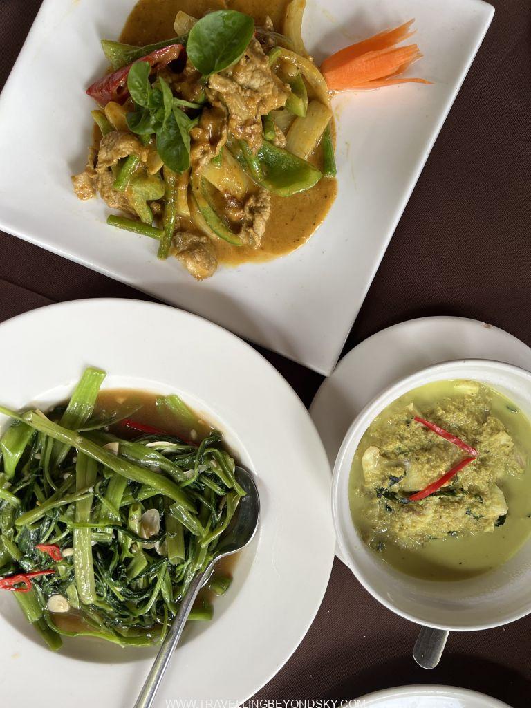 เล่าเรื่องที่พักแล้วก็ต้องมาเรื่องอาหาร จำได้ว่าไปเขมรเมื่อ 19 ปีที่แล้วร้านอาหารดีๆ มีน้อยมาก แต่ไปครั้งนี้มีร้านอาหารมากมายที่ดูดี ตั้งแต่ร้านริมถนน ร้านข้าวแกงที่ดูสะอาดสะอ้าน ไปจนถึงคาเฟ่และร้านอาหารแบบหรู ทริปนี้เรากินมื้อกลางวันที่ร้านทั่วไปง่ายๆ ที่นักท่องเที่ยวมักจะกินกัน ซึ่งอันที่จริงฉันก็ไม่ค่อยอยากจะลองแบบนี้เท่าไหร่ แต่ไกด์เป็นห่วงเรื่องความสะอาด เมนูที่เราสั่งก็เหมือนอาหารไทยมาก เช่นห่อหมก ผัดผักบุ้ง ผัดพริกแกง ขนมจีนน้ำยา มีขนมครกด้วย แต่ของเขาจะไม่หวาน อาหารเขมรนี่เหมือนอาหารไทยมากๆ เลยแต่รสชาติไม่เข้มข้นเท่า มีคนบางคนบอกว่าอาหารเขมรก็คืออาหารไทยที่ไม่อร่อยนั่นเอง แหมแต่ที่ฉันชิมมาก็ไม่ได้แย่ขนาดนั้นแม้จะแอบเห็นด้วยนิดๆ