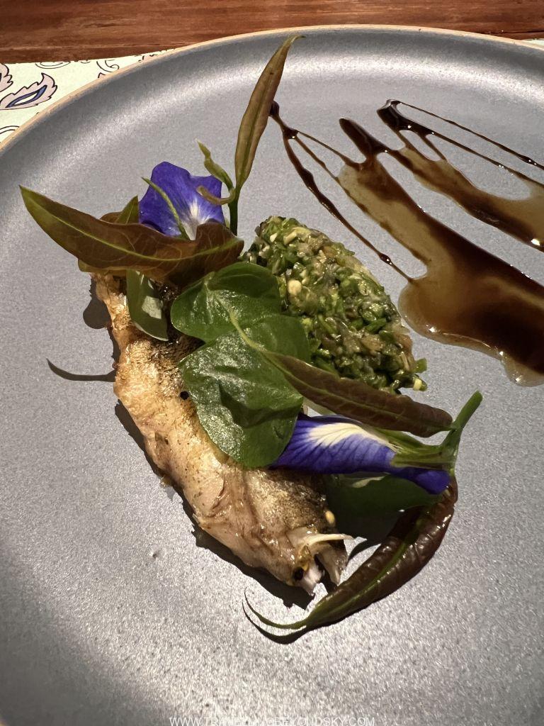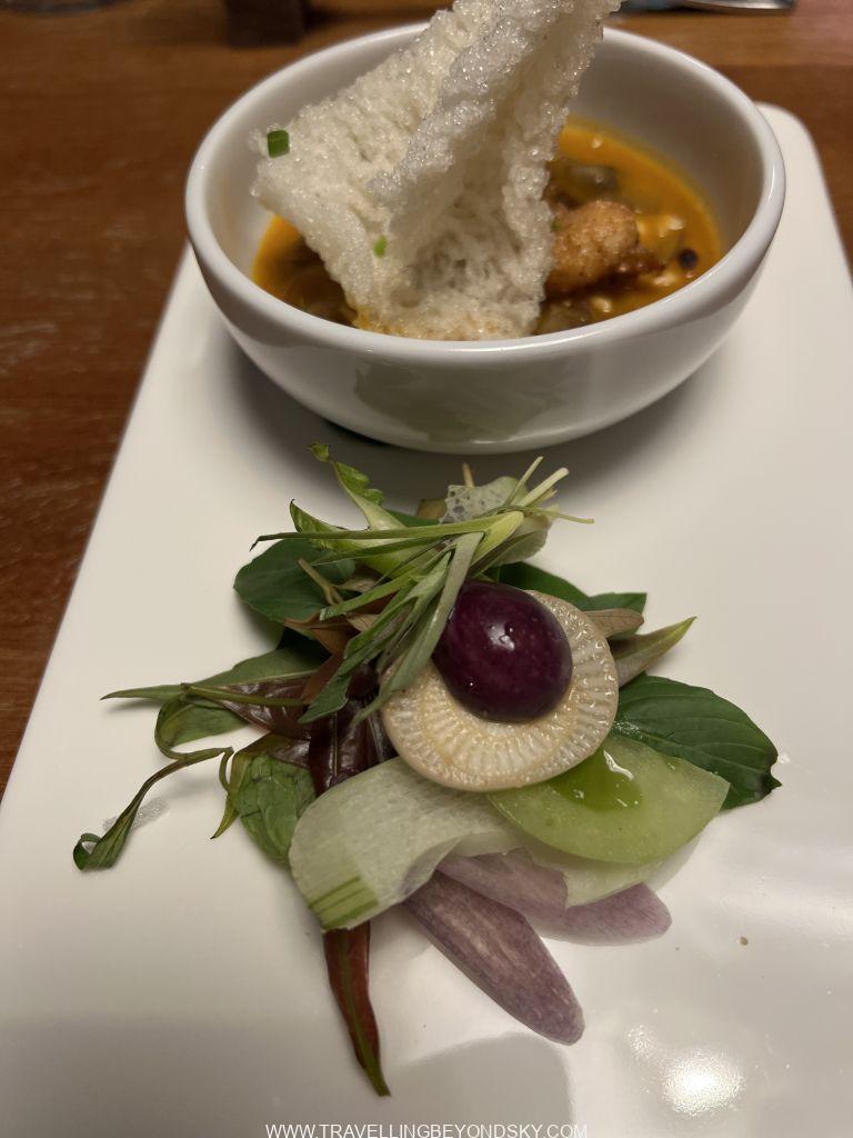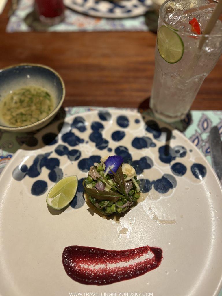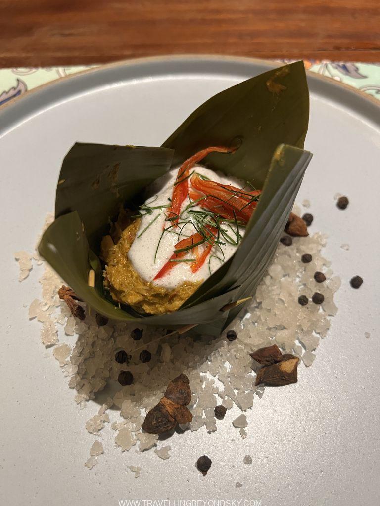 สำหรับตอนเย็นฉันเลือกร้านอาหารแบบฟิวชั่นเขมร ทำโดยเชฟอายุน้อย เป็นคนยุคใหม่ มีความคิดสร้างสรรค์ ชอบทดลองอะไรแปลกๆ จึงทำให้ได้ชิมอาหารเขมรที่ไม่จืดชืดน่าเบื่อจนเกินไปนัก ทั้งสองร้านจัดมาแบบเป็นเซ็ตเมนูแบบจานเล็กจานน้อย คอร์สหนึ่งก็หลายจานทีเดียว อาหารเขาใช้ผักค่อนข้างเยอะและเป็นผักสมุนไพรเสียมาก เนื้อสัตว์ก็เป็นปลากุ้งเป็นส่วนใหญ่ แทบไม่มีเนื้อแดงเลย ร้านแรกที่ไปคือร้านชื่อ Wat Damnak ร้านสวยมากมีแต่ฝรั่งนั่งกัน