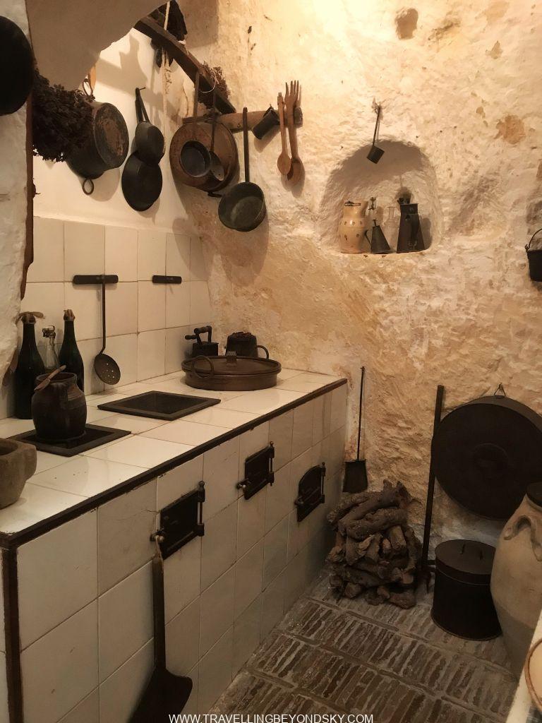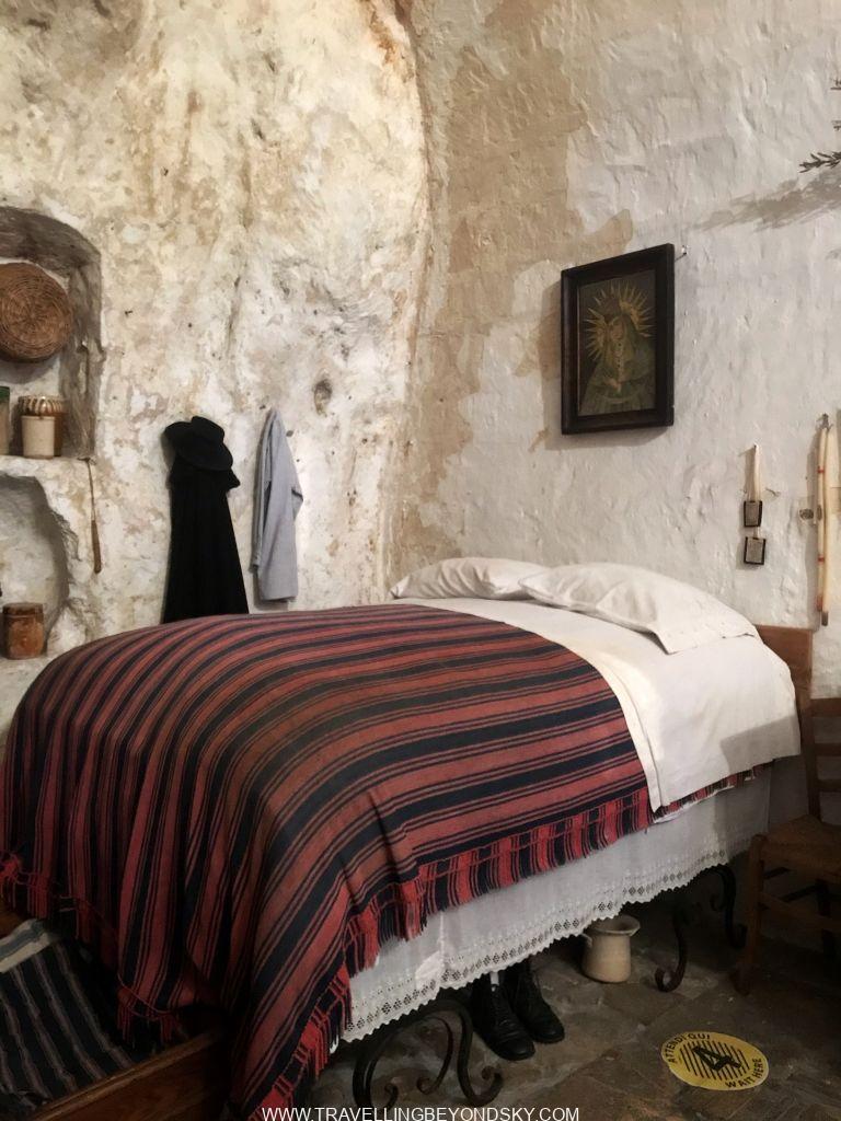 ส่วนใครที่ไม่ได้นอนพักในถ้ำโบราณอย่างฉัน หากอยากรู้ว่าชีวิตคนถ้ำสมัยศตวรรษที่ 18 เขาอยู่กันอย่างไร ไปดูได้ที่ Casa Grotta of Vico Solitario เขาจัดห้องไว้เหมือนที่คนเคยอยู่ ในถ้ำหนึ่งห้องนั้นมีเตียงที่ยกสูง (เผื่อน้ำท่วม และให้ไก่อยู่ใต้เตียง) มีคอกลาอยู่ปลายเตียงกันเลยทีเดียว ครัวมุมหนึ่ง กี่ทอผ้ามุมหนึ่ง เปลลูกเล็กวางบนพื้น กลางคืนดึงลิ้นชักออกเอาเบาะวางให้ลูกอีกคนนอน คือหลายคนรวมทั้งหมูลาไก่สัตว์เลี้ยงทั้งหลายอยู่รวมกันในถ้ำเดียวเลย ห้องน้ำไม่มี ถึงว่ารัฐต้องให้ย้ายออกเพราะมันไม่ค่อยถูกสุขลักษณะนั่นเอง