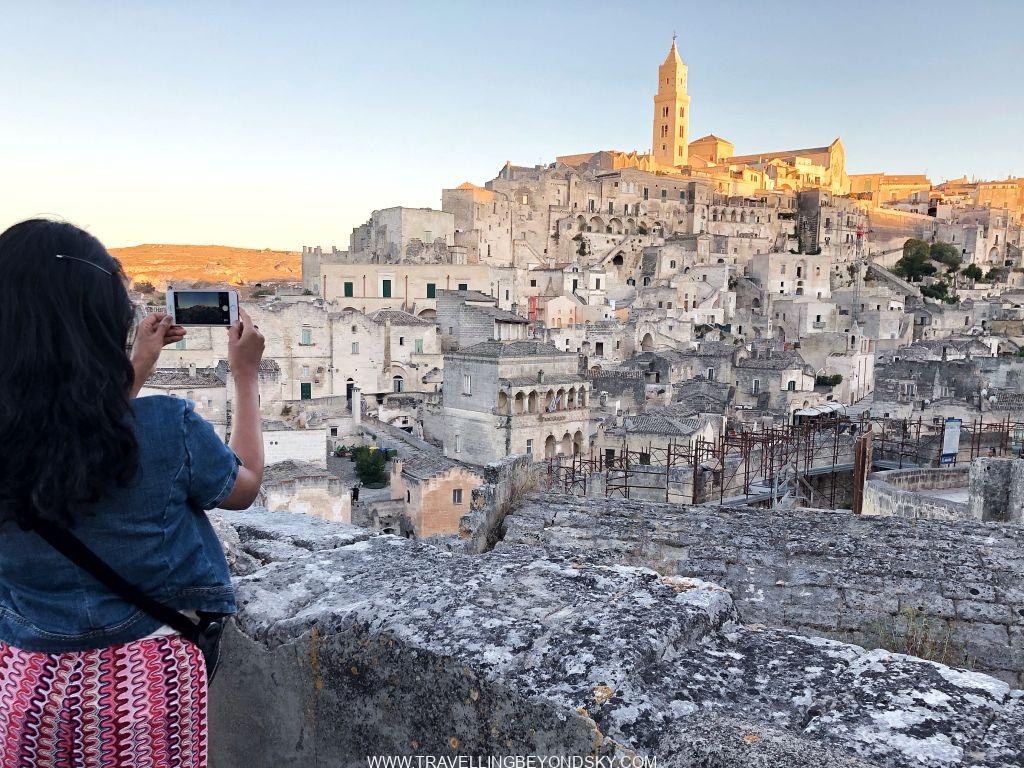 ฉันมาถึงเมืองมาเตร่าตอนพระอาทิตย์ยอแสงจะตกดินพอดี พอจอดรถในเมืองแล้วโผล่จากถนนเพื่อจะเดินเข้า Sassi หรือตรงเมืองถ้ำมรดกโลกนั้น ก็ปะทะเจอวิวภูเขาพรุนอย่างที่เคยฝันว่าจะมาเห็นด้วยตาเปล่าในแสงสีส้ม สวยตะลึงมาก นี่เลยภาพที่อยากเห็น สมเป็นมรดกโลกโดยแท้