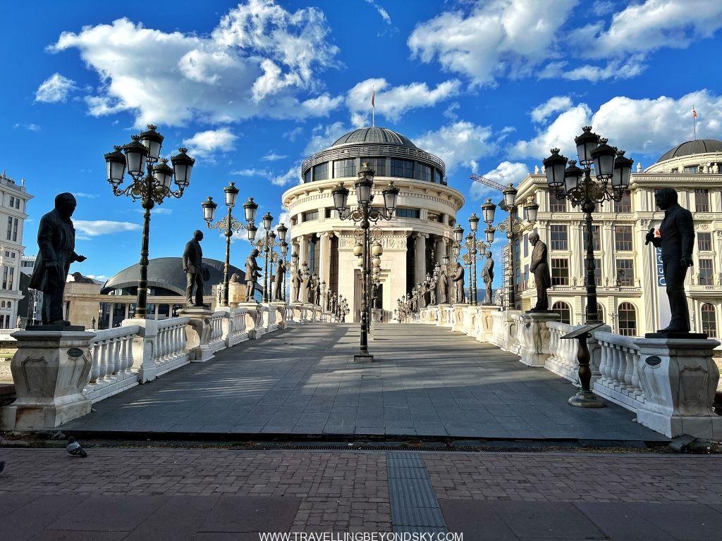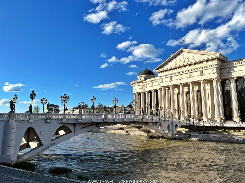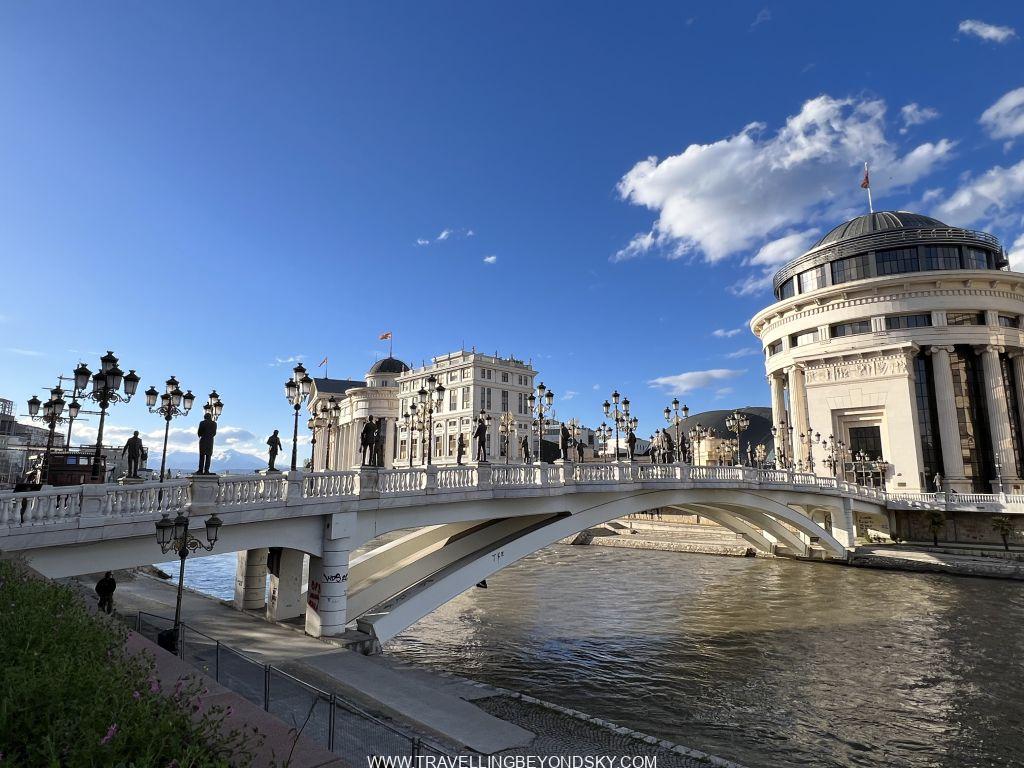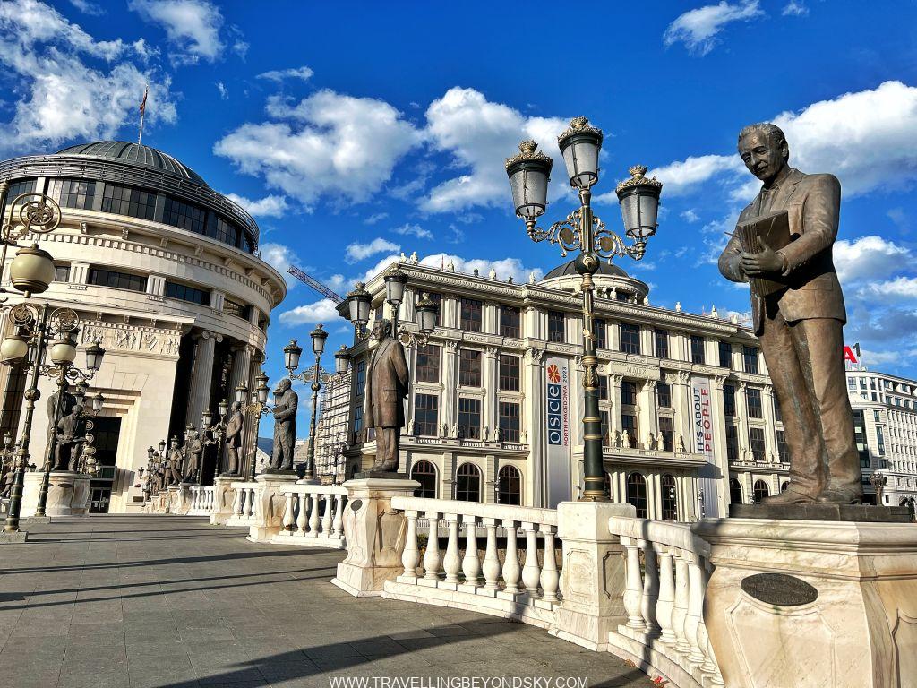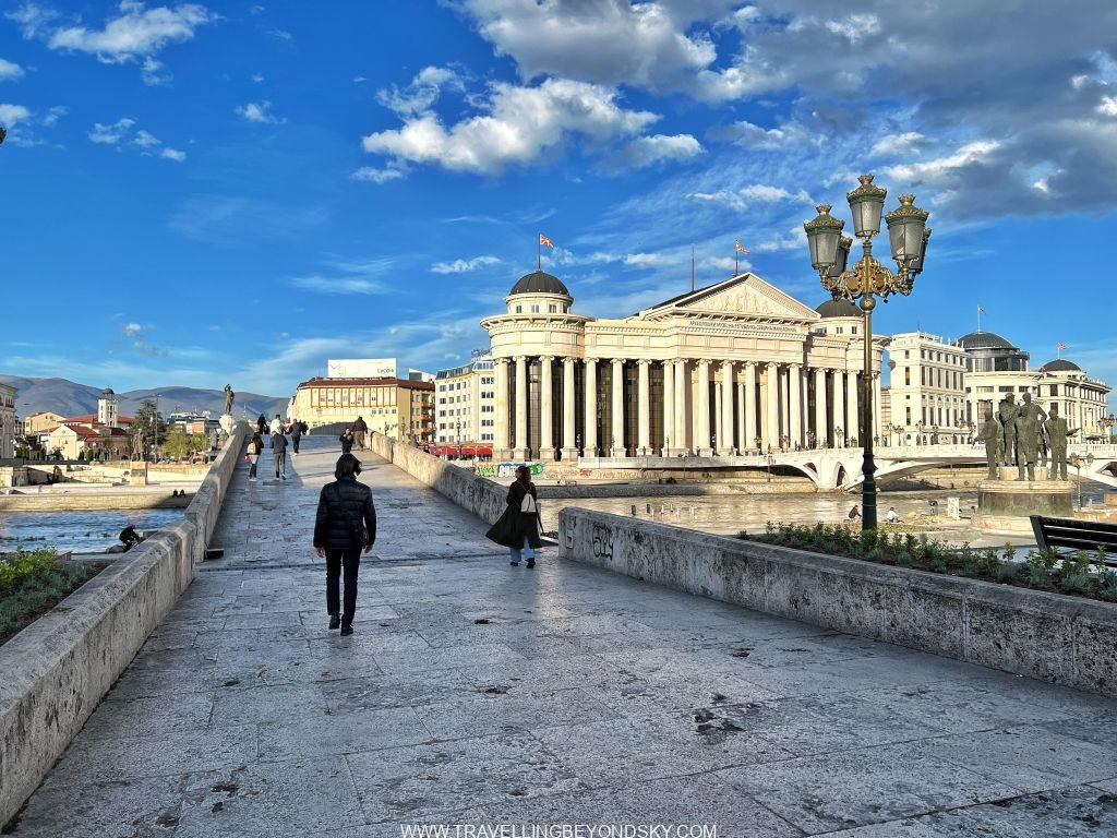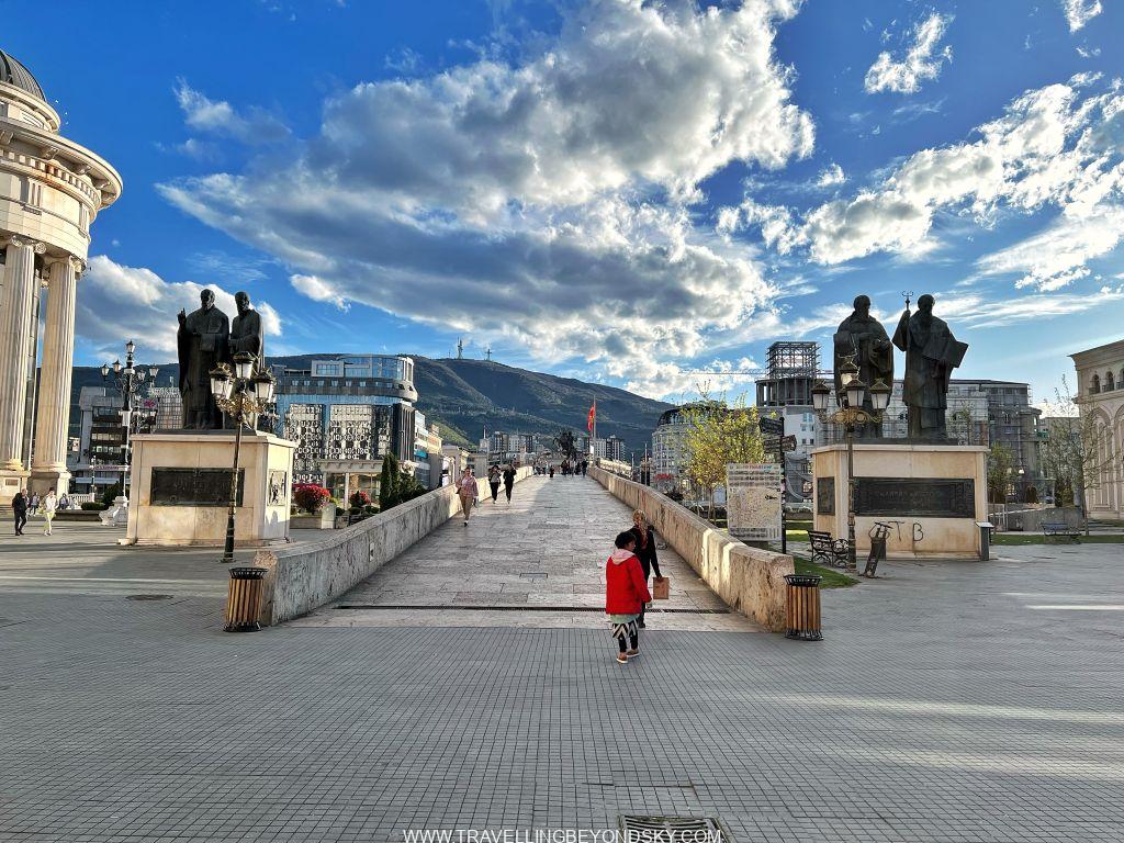 ฉันได้เดินชมเมืองสโกเปียเกือบทั่ว ในเมืองมีแม่น้ำ Vardar ไหลผ่าน จึงมีสะพานข้ามหลายแห่งที่ควรไปชม เช่น Art Bridge ที่มีรูปปั้นศิลปินสารพัดแขนงอยู่ถึง 29 รูปปั้น ติดกันคือ The Bridge of Civilisations in Macedonia มีรูปปั้นยืนเต็มสองฝั่งสะพานเช่นกัน ดูแปลกดี จะว่าสวยก็ไม่เชิง เมืองนี้เขาชอบรูปปั้นมากๆ เลย เต็มเมืองไปหมด ไม่ว่าจะในสวนสาธารณะ ริมถนน เยอะจนเกินพอดี เลยมีคนเหน็บเอาว่า นี่คือเมืองหลวงที่ kitsch ที่สุดในโลก สงสารจัง แต่ฉันก็รู้สึกอย่างนั้นเหมือนกัน