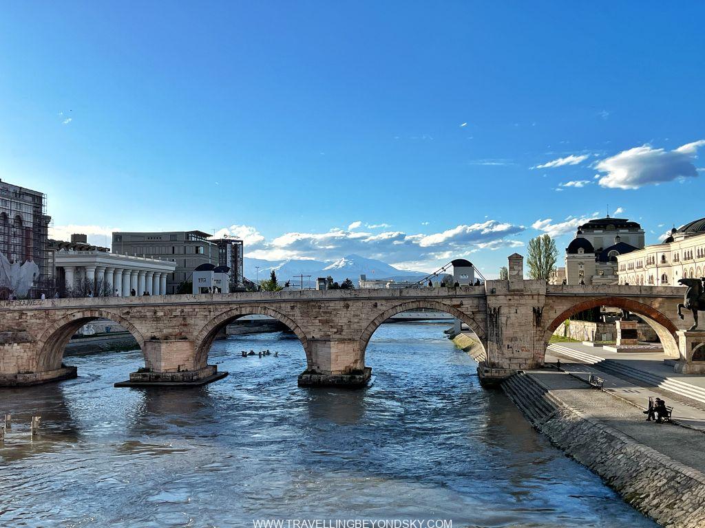 สะพานอีกแห่งคือ Stone Bridge เป็นสะพานเก่า อยู่ตรงริมลาน Macedonia Square ข้ามแม่น้ำไปอีกฝั่งที่มี Museum of the Macedonian Struggle for Independence และ Macedonian Holocaust Museum อยู่ แล้วก็มีอนุสาวรีย์รูปปั้นน้ำพุอีกสองแห่ง รูปปั้นเขาเยอะจริง