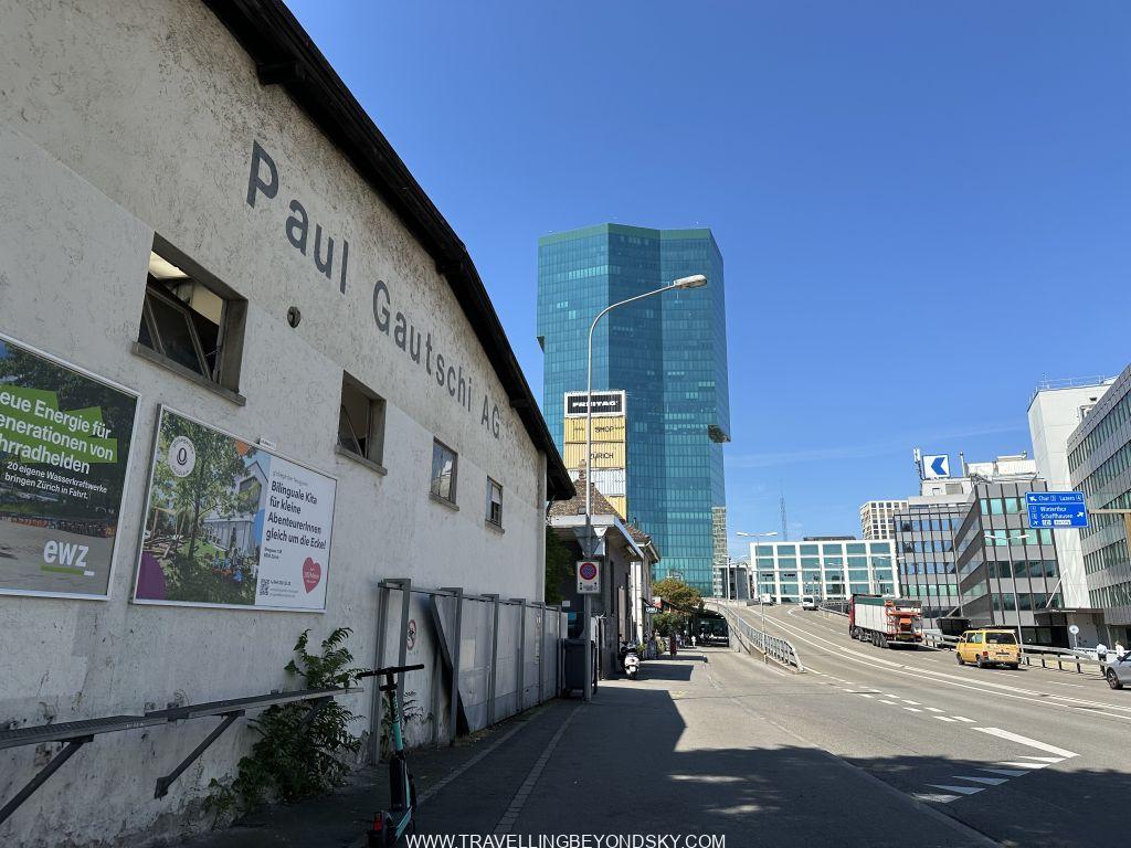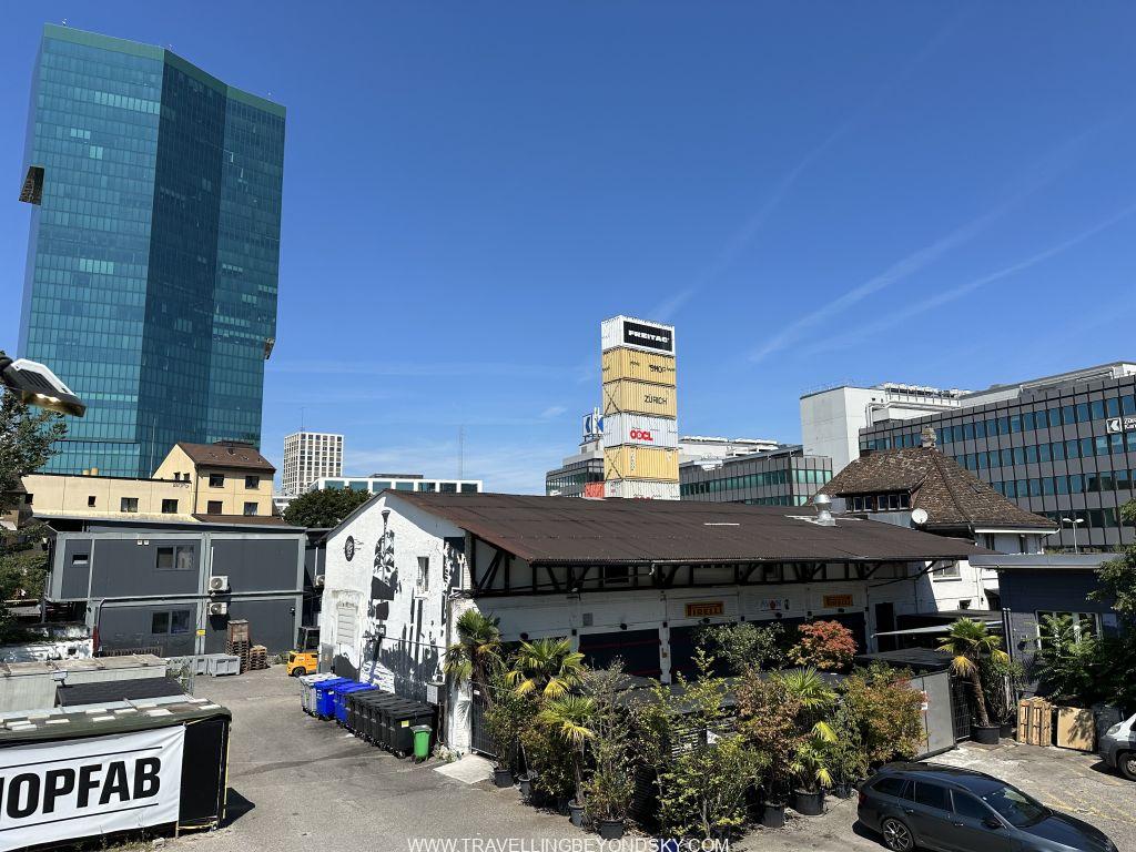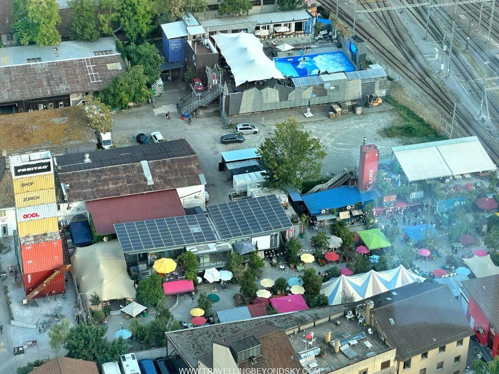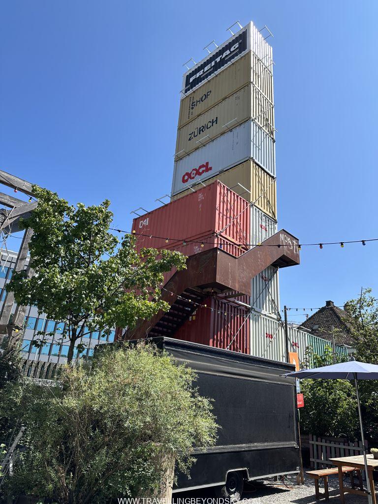 แต่ถ้าถามฉันให้บอกพิกัดง่ายๆ คงต้องบอกว่าให้ตั้งพิกัดมาที่ร้าน Flagship ของ Freitag ที่ขายกระเป๋าทำจากผ้าใบคลุมรถบรรทุกนั่นแหละ เขาเอาคอนเทนเนอร์เก่ามาซ้อนกันขึ้นไปจนเป็นตึกสูงแล้วข้างในเป็นร้านขายของ ชั้นบนสุดเป็นดาดฟ้าที่เราไต่บันไดขึ้นไปชมวิวได้ เขาว่านี่เคยเป็นตึกที่สูงที่สุดของซูริค แต่ตอนนี้ตึกที่สูงสุดของจริงคือ Prime Tower ที่เป็นกระจกสีฟ้าอยู่ด้านหลัง มองดูแล้วตรงข้ามกันดี