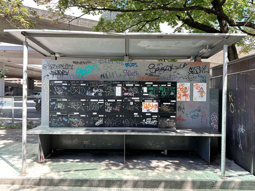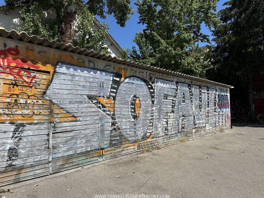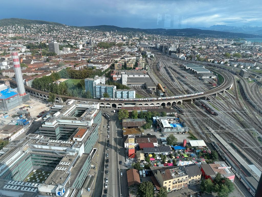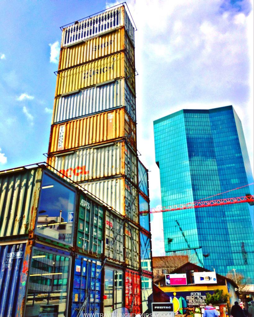 แต่ถ้าถามฉันให้บอกพิกัดง่ายๆ คงต้องบอกว่าให้ตั้งพิกัดมาที่ร้าน Flagship ของ Freitag ที่ขายกระเป๋าทำจากผ้าใบคลุมรถบรรทุกนั่นแหละ เขาเอาคอนเทนเนอร์เก่ามาซ้อนกันขึ้นไปจนเป็นตึกสูงแล้วข้างในเป็นร้านขายของ ชั้นบนสุดเป็นดาดฟ้าที่เราไต่บันไดขึ้นไปชมวิวได้ เขาว่านี่เคยเป็นตึกที่สูงที่สุดของซูริค แต่ตอนนี้ตึกที่สูงสุดของจริงคือ Prime Tower ที่เป็นกระจกสีฟ้าอยู่ด้านหลัง มองดูแล้วตรงข้ามกันดี