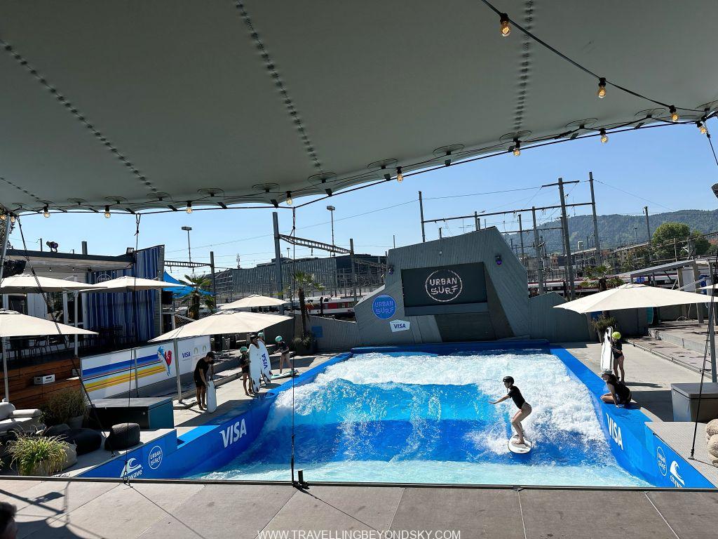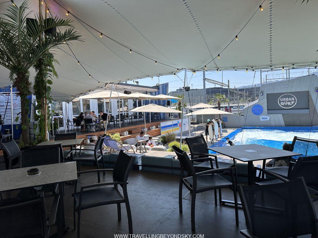 แล้วเมื่อหลายปีก่อนมีสระน้ำสำหรับฝึกเล่นเซิร์ฟมาเปิด ฉันแวะมาดูตอนที่เขาเปิดอาทิตย์แรกก็ว่าเก๋ดีแต่ไม่ได้แวะมาอีกเลย หลายปีผ่านไปได้เดินขึ้นไปอีกครั้ง ปรากฏเขาทำบริเวณโดยรอบยิ่งดีกว่าเดิมอีก เหมือนเป็นบาร์ริมทะเลกลายๆ มีคนมานั่งทำงานพร้อมแลปทอปไปด้วย ได้อารมณ์สมชื่อ Urban Surf