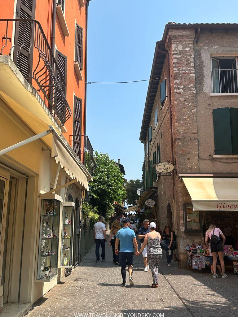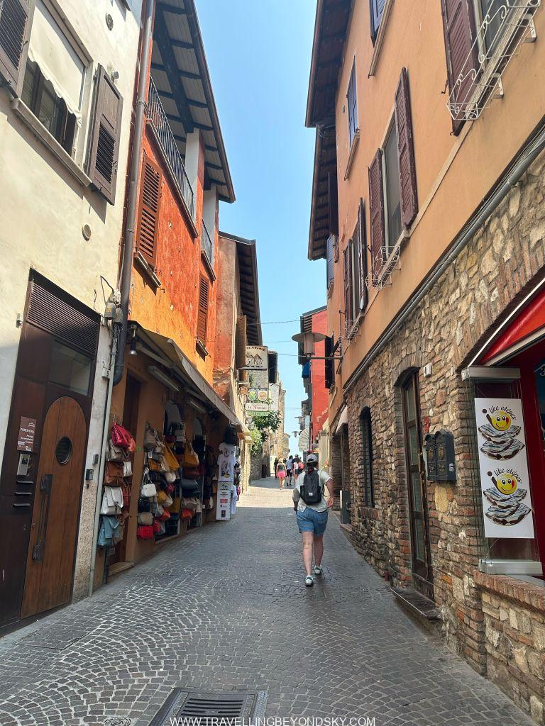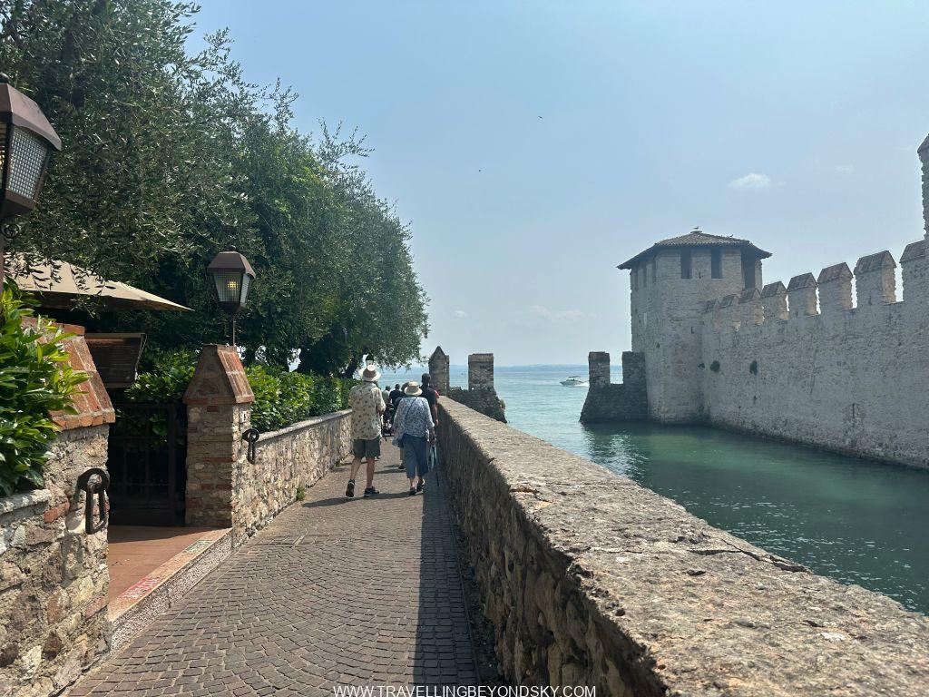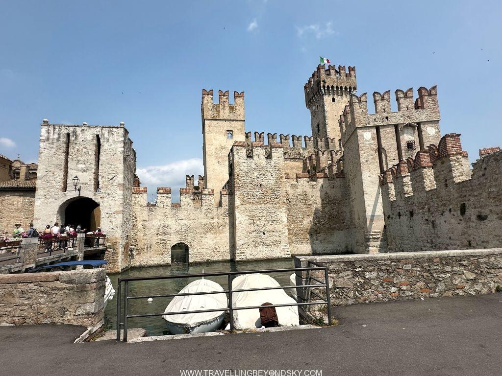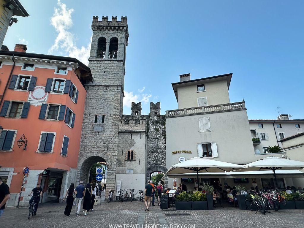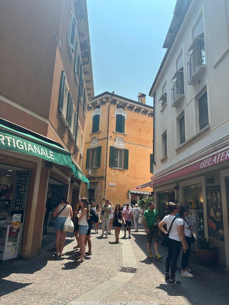 พอเข้าประตูเมืองไปแล้วก็จะถึงบริเวณเมืองเก่าซึ่งมีตึกรามสีสันสดใสตามแบบอิตาเลียน เต็มไปด้วยร้านอาหารร้านขายของ เดินเล่นเพลินมาก แต่ที่เด่นที่สุดนั้นก็คือ ตรงติดประตูเมืองเลยมีปราสาทโบราณตั้งอยู่ในน้ำ คือ Scaligero Castle มีลักษณะเป็นป้อมปราการจากยุคกลางที่ใช้ป้องกันเมืองโดยที่มีน้ำอยู่ล้อมรอบ และมีประตูที่ชักเป็นสะพานขึ้นลงได้ ปัจจุบันด้านในเป็นพิพิธภัณฑ์ ฉันไม่ได้เข้าไปชมเพราะคิวยาวมาก เวลาย่างเข้าหน้าร้อนที่อิตาลีนี่เมืองต่างๆ แบบนี้จะคนค่อนข้างแน่นเป็นปกติ