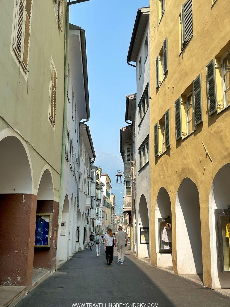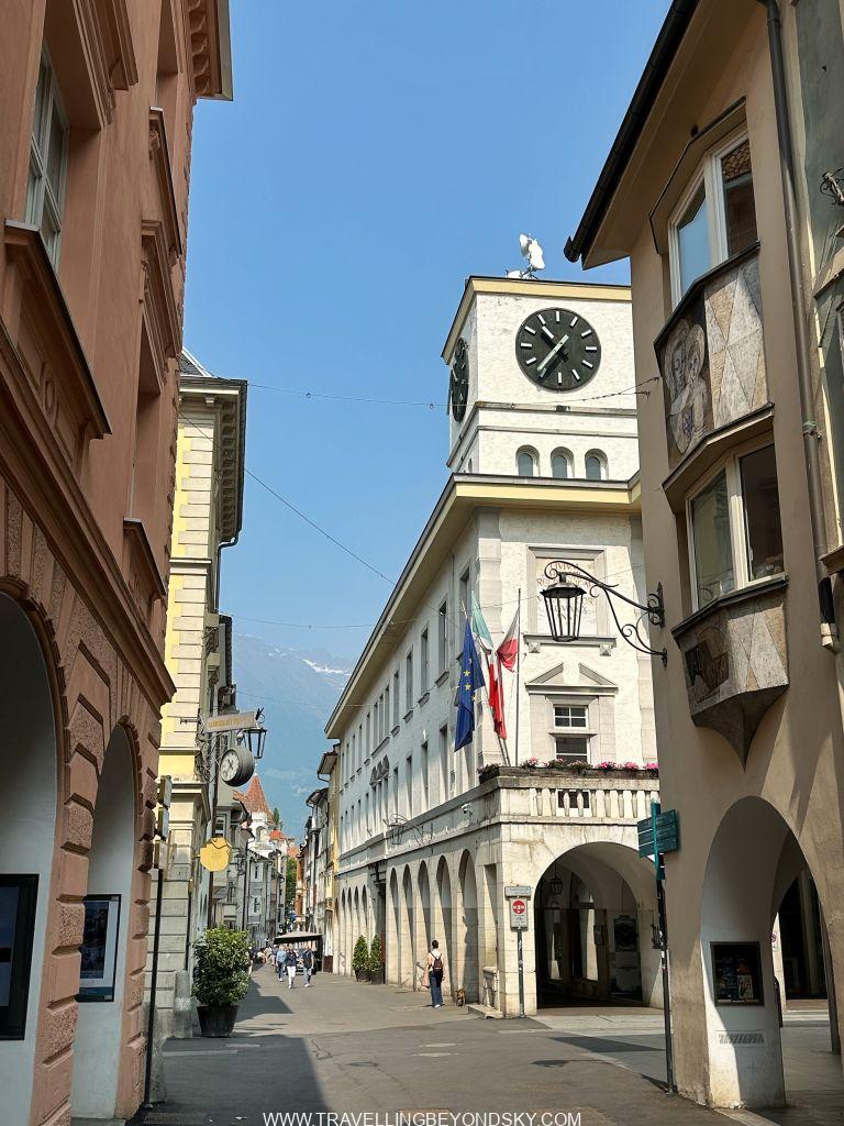 ประวัติความเก่าแก่ของเมืองนั้นย้อนไปก่อนคริสตกาลทีเดียว และเมอราโน่ได้กลายมาเป็นส่วนหนึ่งของราชอาณาจักรอิตาลีหลังสงครามโลกครั้งที่หนึ่งเหมือนกับ Riva del Garda สำหรับตัวเมืองนั้นก็เดินเที่ยวได้เพลินๆ เลย ถนนคนเดินที่ตัดกลางเมืองมีร้านค้าสองข้างทาง ซึ่งหน้าร้านมีหลังคาของชั้นสองปกคลุมแบบที่เรียกว่า Portico อย่างในเมืองใหญ่หลายเมืองของอิตาลี เมืองเก่ามีประตูเมืองหลายแห่งเช่น Vinschgauer Tor, Passeirer Tor และ Bozener Tor มีโบสถ์เช่น St. Nicholas’ Church และ St. Barbara’s Chapel และด้านหลังศาลาว่าการมีปราสาทโบราณขนาดเล็กๆ น่ารักคือ Princely Castle ที่เคยเป็นที่พักอาศัยของอาร์คดยุคของออสเตรีย